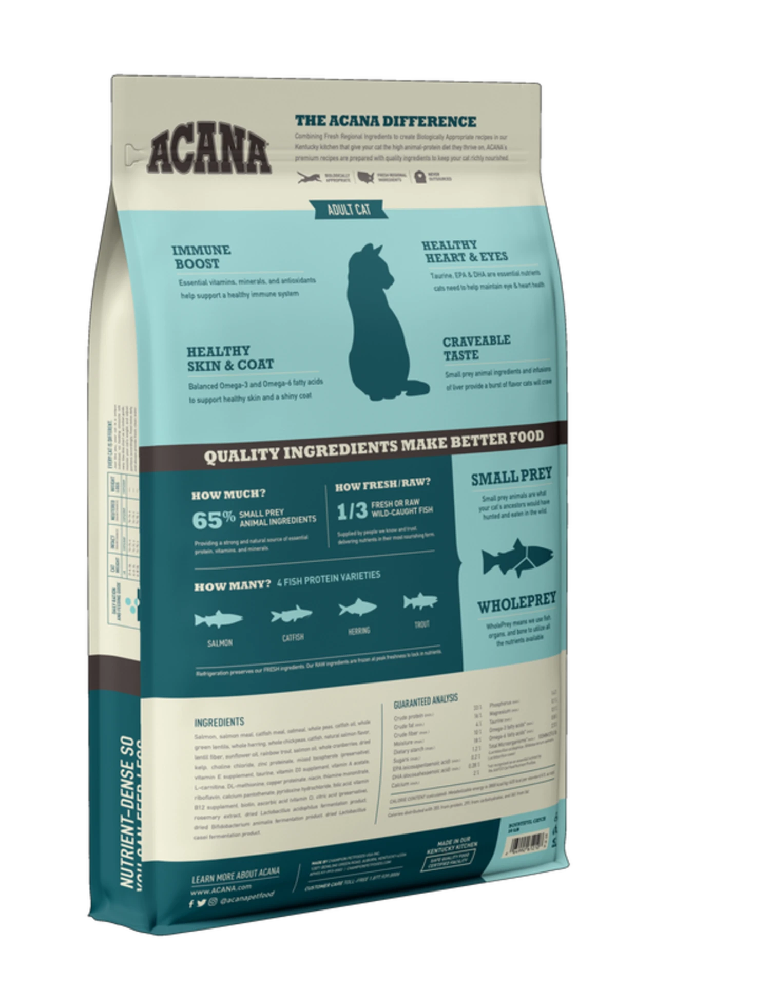 • METABOLIZABLE ENERGY: 3800 kcal/kg (433 kcal per 250ml/114g cup) with calories distributed to support peak conditioning; 37% from protein, 27% from carbohydrates, and 36% from fat. • ACANA Bountiful Catch is formulated to meet the nutritional levels established by FEDIAF for Adult Maintenance.