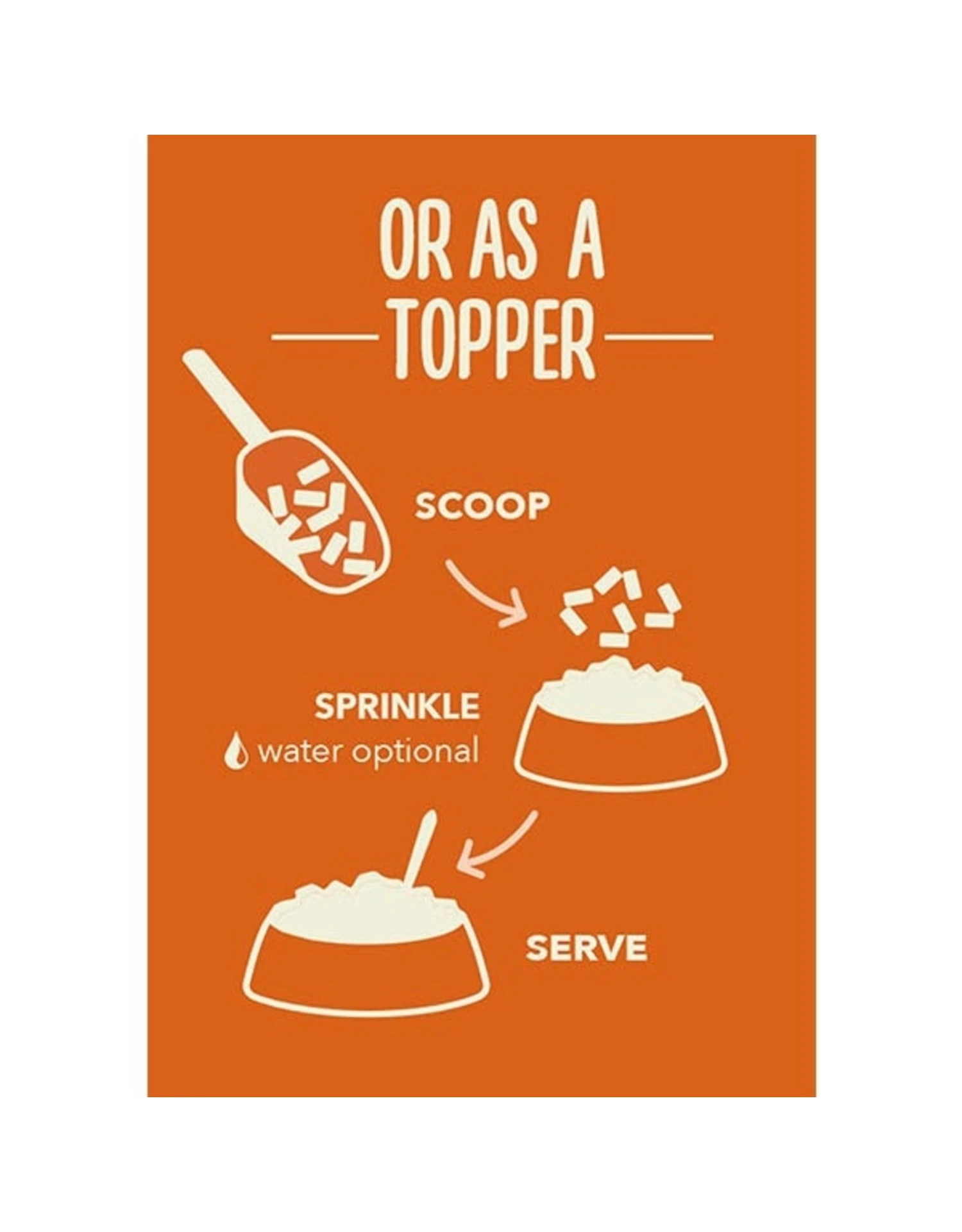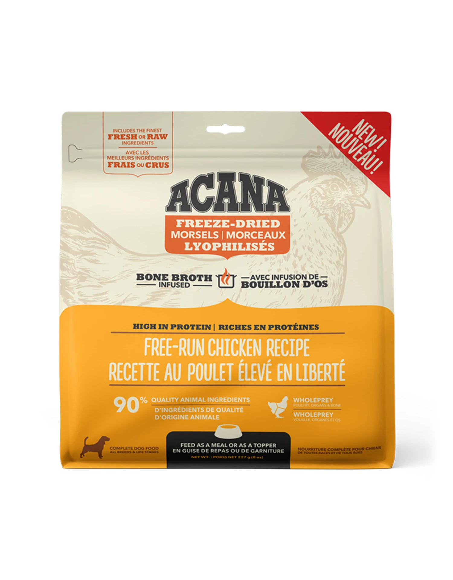 Acana Bone Broth Infused Freeze-Dried Morsels – Free-Range Chicken features 83% free-range chicken including the organs and bone, 10% fresh Mackeral with 7% fruits and vegetables such as pumpkin and cranberries with chicken bone broth.