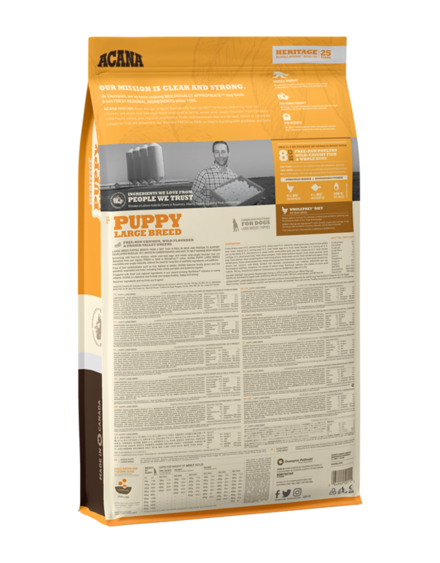 Fresh chicken meat (16 %), chicken meal (15 %), turkey meal (14 %), red lentils, whole green peas, fresh chicken giblets (liver, heart, kidney) (6 %), herring meal (4 %), fresh eggs (4 %), fresh whole flounder (4 %), herring oil (3 %), sun-cured alfalfa (2 %), field beans (2 %), green lentils, whole yellow peas, pea fibre, chicken fat (2 %), fresh chicken cartilage (2 %), dried brown kelp, fresh whole pumpkin, fresh whole butternut squash, fresh whole parsnips, fresh kale, fresh spinach, fresh mustard greens, fresh turnip greens, fresh whole carrots, fresh apples, fresh pears, freeze-dried chicken liver, freeze-dried turkey liver, fresh whole cranberries, fresh whole blueberries, chicory root, turmeric, milk thistle, burdock root, lavender, marshmallow root, rosehips. ADDITIVES (per kg): Technological additives: tocopherol-rich extract of natural origin. Nutritional additives: zinc chelate of amino acids hydrate: 100 mg. Zootechnical additives: Enterococcus faecium NCIMB10415: 600×10^6 CFU.