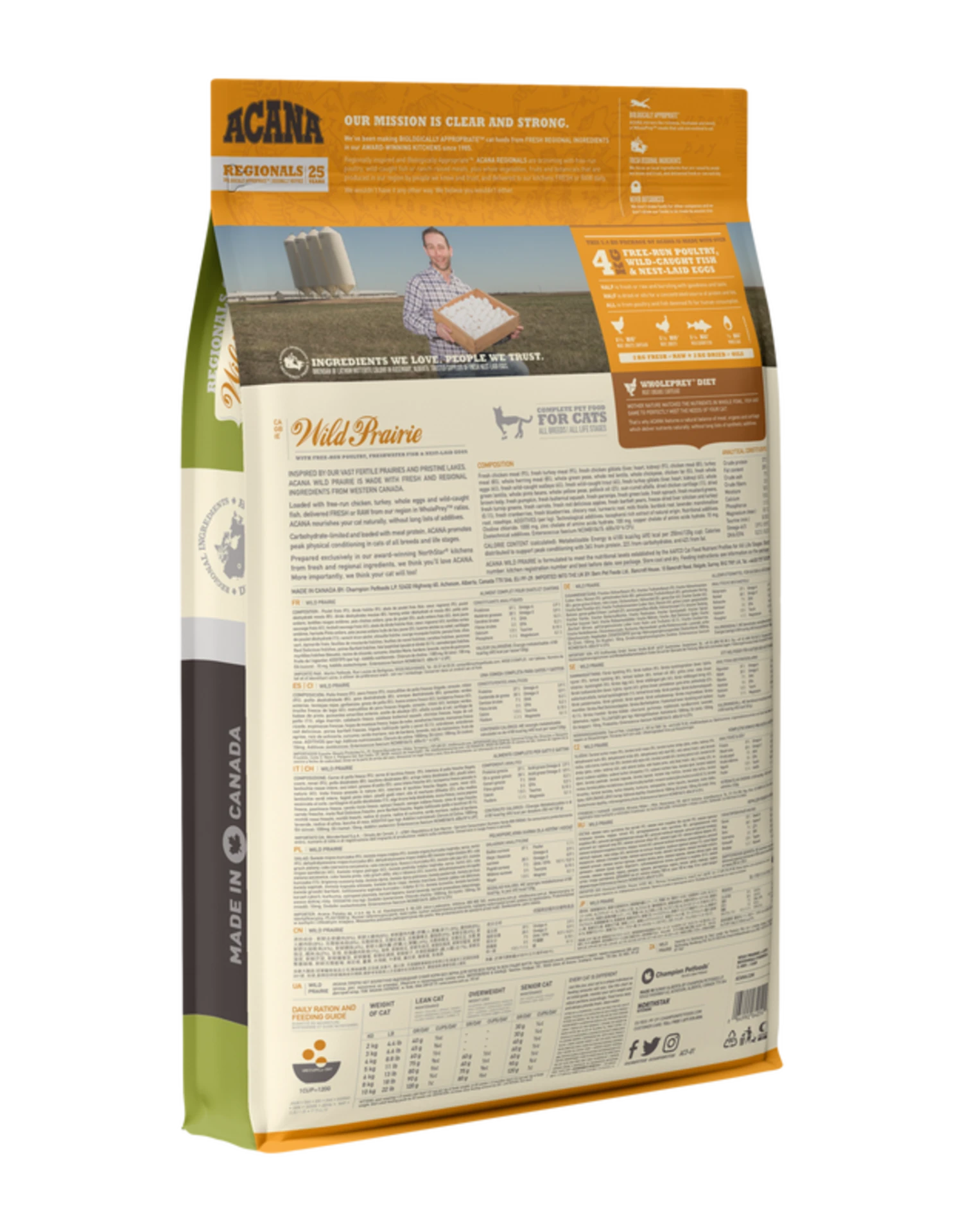 Fresh chicken meat (9%), fresh turkey meat (9%), fresh chicken giblets (liver, heart, kidney) (9%), chicken meal (8%), turkey meal (8%), whole herring meal (8%), whole green peas, whole red lentils, whole chickpeas, chicken fat (5%), fresh eggs (4%), fresh wild-caught walleye (4%), fresh trout (4%), fresh turkey giblets (liver, heart, kidney) (4%), whole green lentils, whole pinto beans, whole yellow peas, pollock oil (2%), sun-cured alfalfa, dried chicken cartilage (1%), dried brown kelp, fresh pumpkin, fresh butternut squash, fresh parsnips, fresh green kale, fresh spinach, fresh mustard greens, fresh turnip greens, fresh carrots, fresh red delicious apples, fresh bartlett pears, freeze-dried liver (chicken and turkey) (0.1%), fresh cranberries, fresh blueberries, chicory root, turmeric root, milk thistle, burdock root, lavender, marshmallow root, rosehips. ADDITIVES (per kg): Technological additives: tocopherol-rich extract of natural origin. Nutritional additives: Choline chloride: 1000 mg, zinc chelate of amino acids hydrate: 100 mg, copper chelate of amino acids hydrate: 10 mg. Zootechnical additives: Enterococcus faecium NCIMB10415: 600×10^6 CFU.