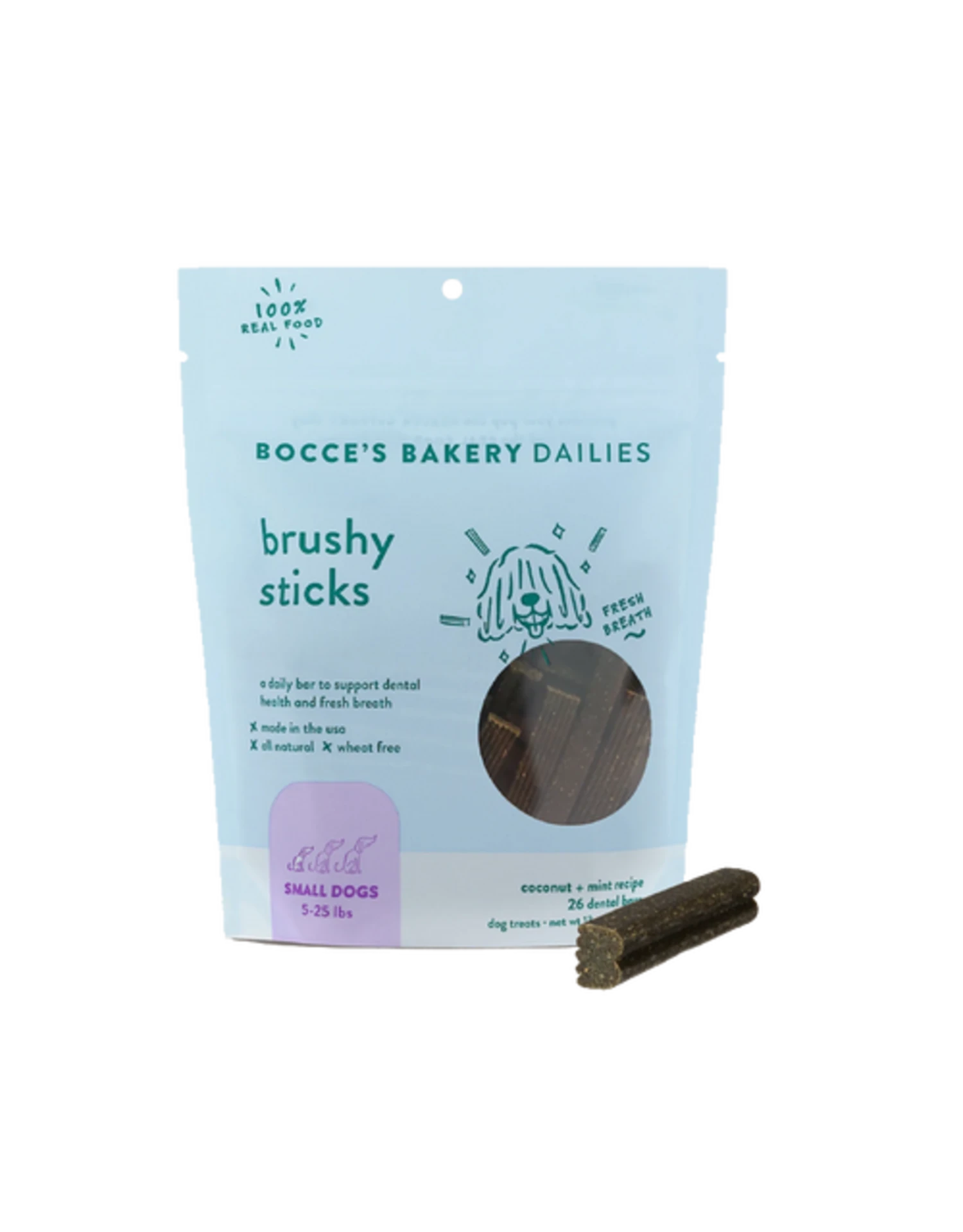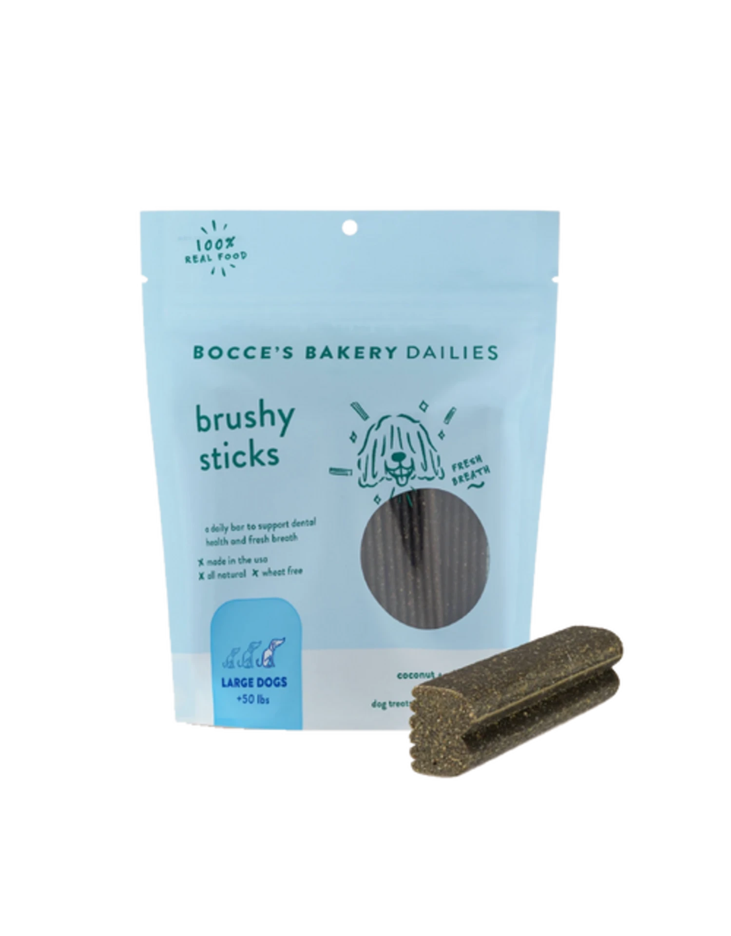 Give your pup a daily Brushy Stick before your next smooch to support dental health & extra fresh breath … because your canine’s canines need love too. Every bar is made with limited and simple ingredients: nutty coconut and crisp mint for the freshest breath, no artificial ‘flavorings’, fillers or chemicals here. Oh, and bristle-shaped for extra cleaning.