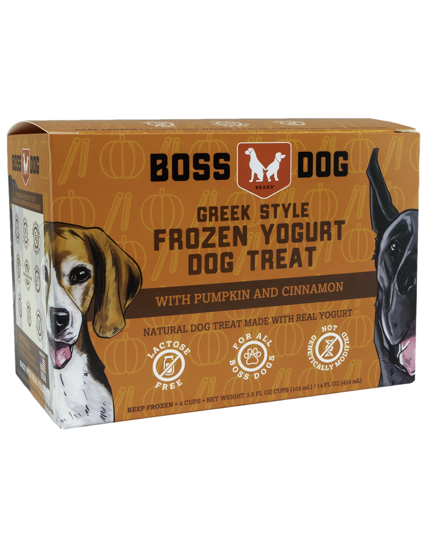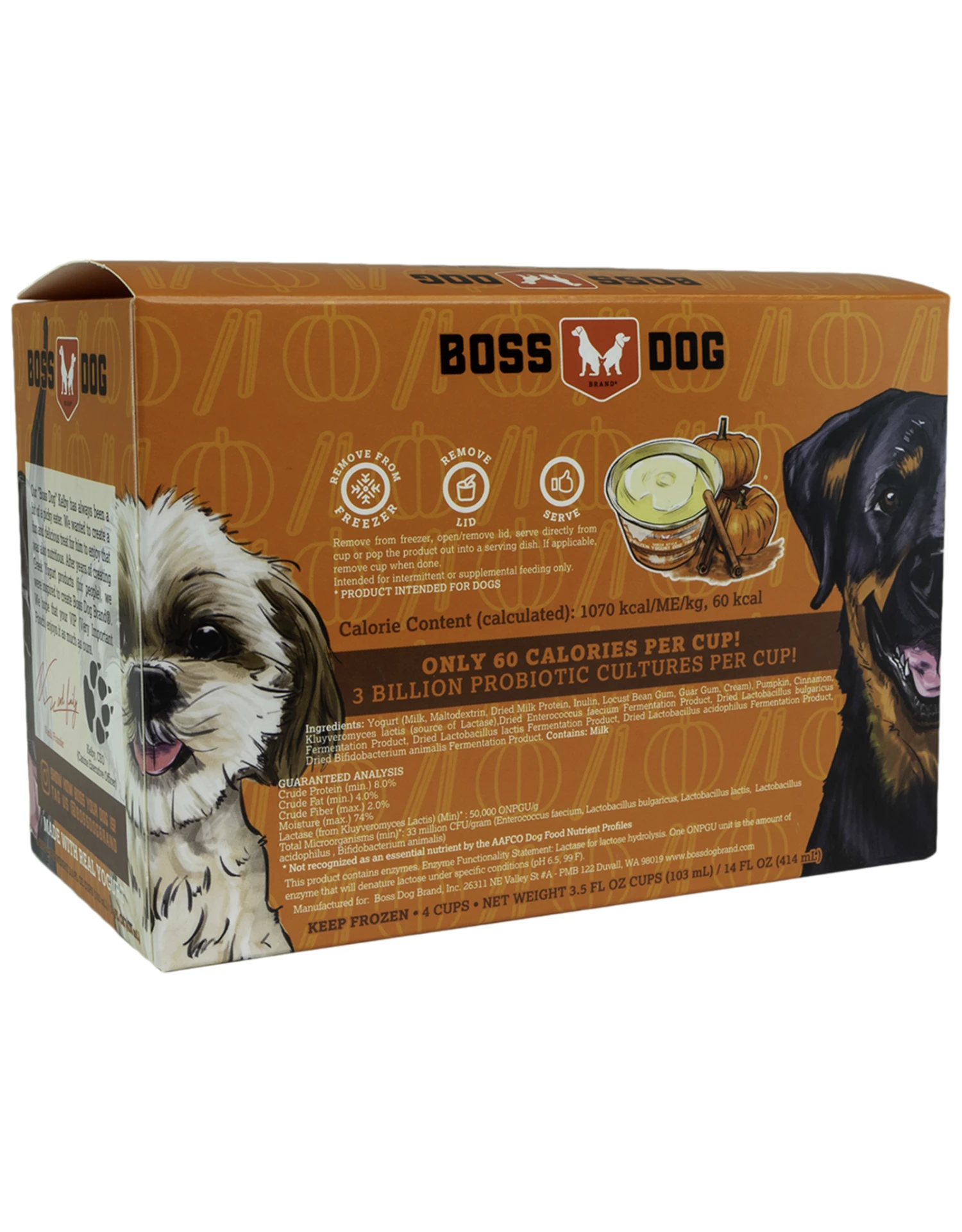 The newest addition to the Boss Dog Brand line up– Greek Style Frozen Yogurt Dog Treats with the delicious combination of pumpkin & cinnamon. These frozen yogurt treats are 100% human grade- ensuring the highest quality ingredients make it into every single cup. All of this great taste also has the added benefit of over 3 billion probiotic cultures per cup as well as prebiotics!