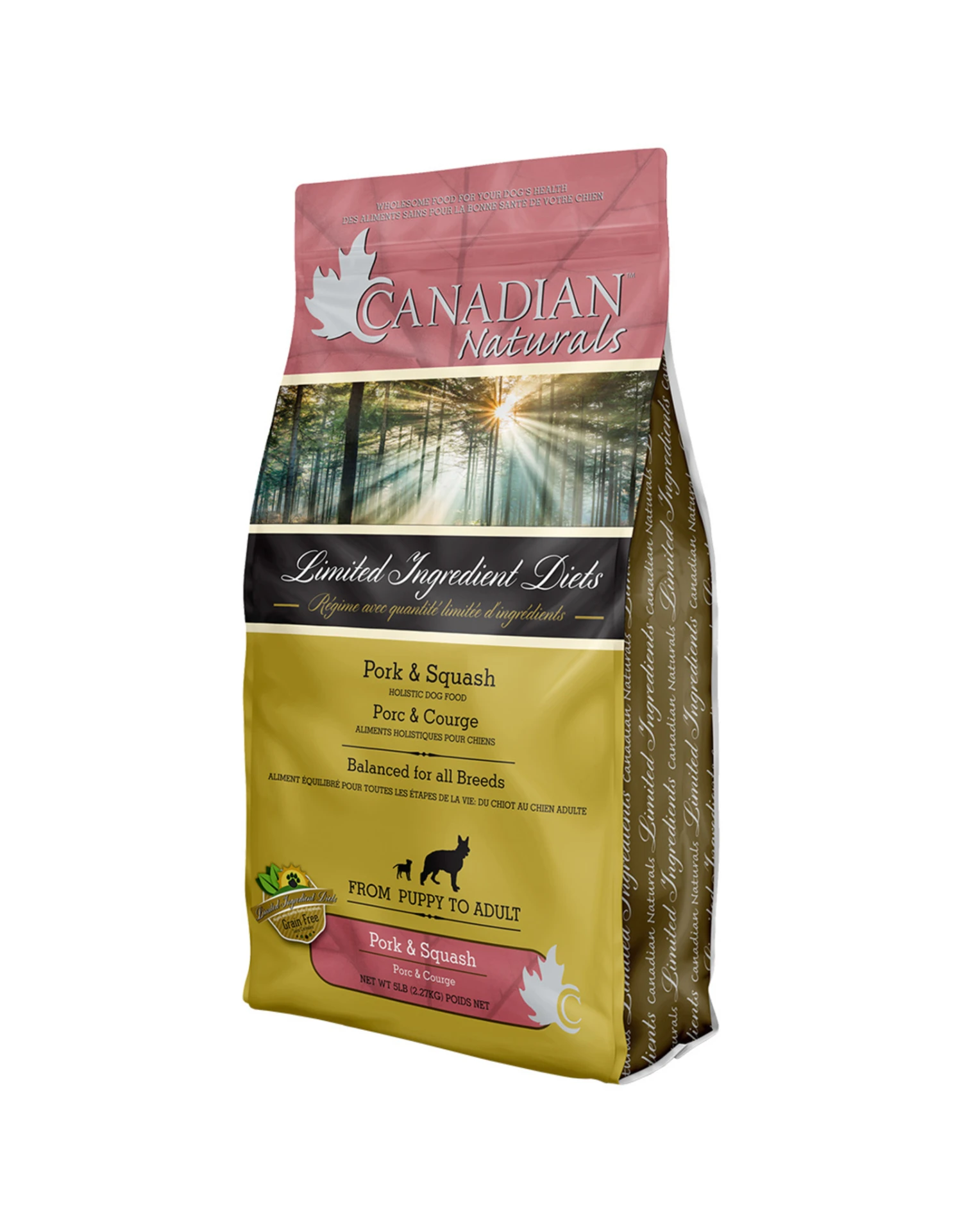 Canadian Naturals LID Pork & Squash Recipe is an excellent food for dogs with food allergies and sensitive digestive tracts. The simple ingredient list includes pork as the single animal protein source. In addition, squash alongside sweet potatoes and flaxseed provides excellent flavour and is easy for dogs to digest. It is a low-glycemic carbohydrate that has been substituted for grains in this formula. The mix of vitamins, minerals, and Omega 3 and six fatty acids ensures that your dog is receiving a quality, balanced diet. Made in Canada. Appropriate for dogs of all breeds and life stages.