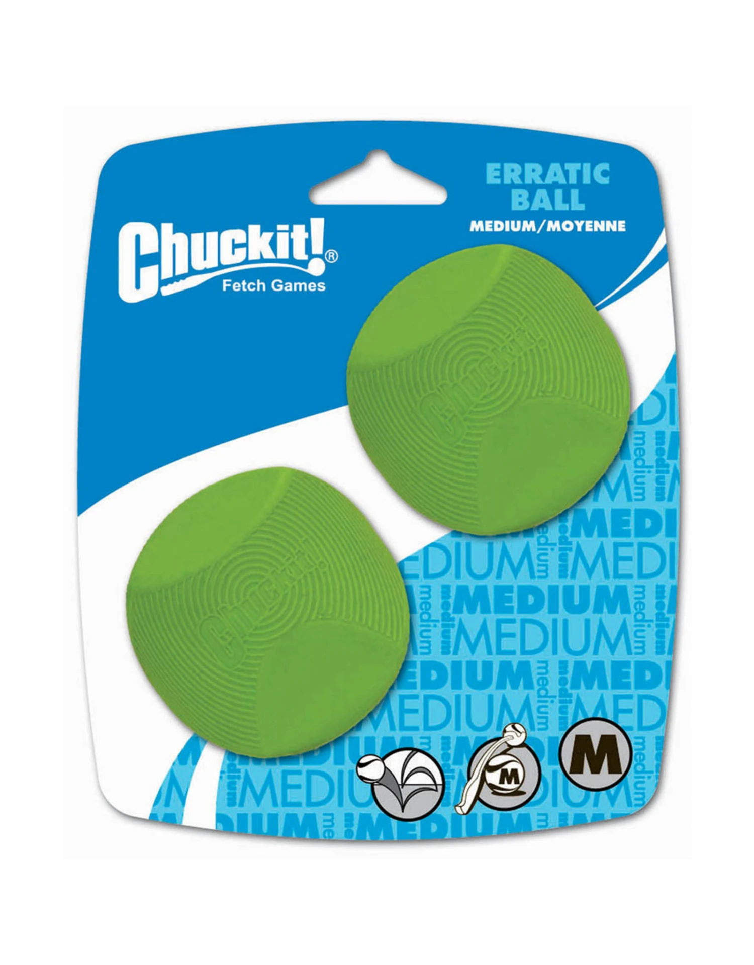 Chuckit!® Erratic Ball is a durable geometrically shaped rubber ball that bounces erratically to keep the game interesting and challenging for your dog. These high-bouncing erratic balls are available in sizes small, medium, and large with one and two-pack options.