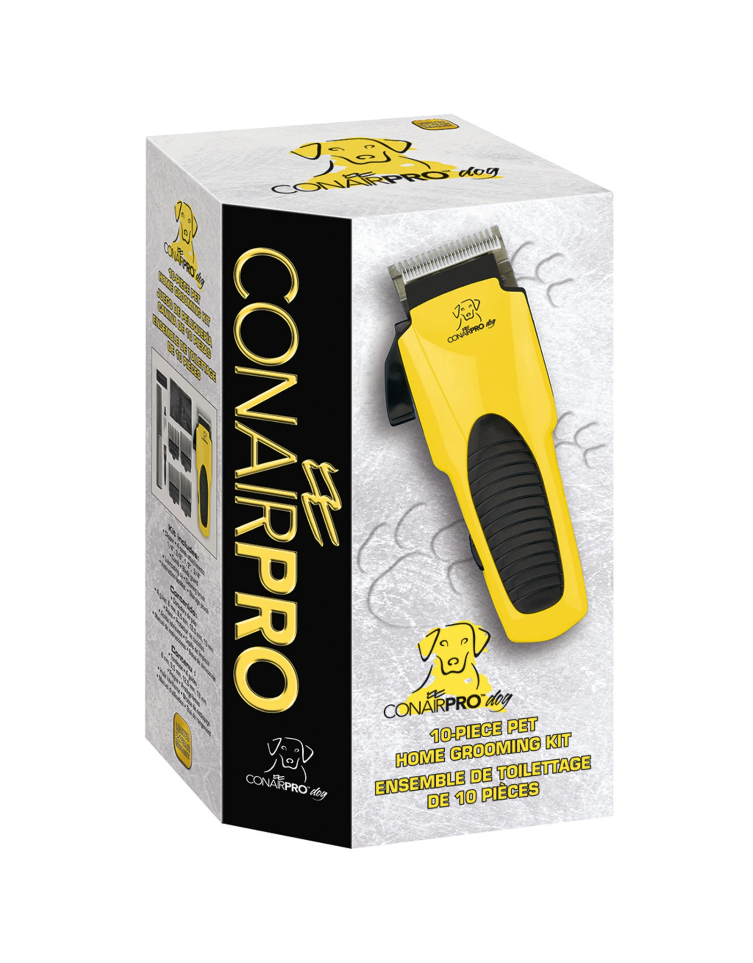 ConairPRO Dog 11-Piece Home Grooming Kit is designed for all-purpose trimming and light clipping of your pet. It features 5 adjustable cutting positions from long to short with locking detents and self-sharpening stainless steel blades for smooth, even cutting. Includes a special trimmer blade for trimming your pet’s paws, face and ears. This 11-piece pet home grooming kit includes 4 comb attachments, comb, blade guard, soft storage pouch, instruction booklet, lubricating oil and cleaning brush. ConairPRO Dog offers pet owners a complete line of home grooming kits, trimmers, pet dryers, grooming tools and pet accessories.