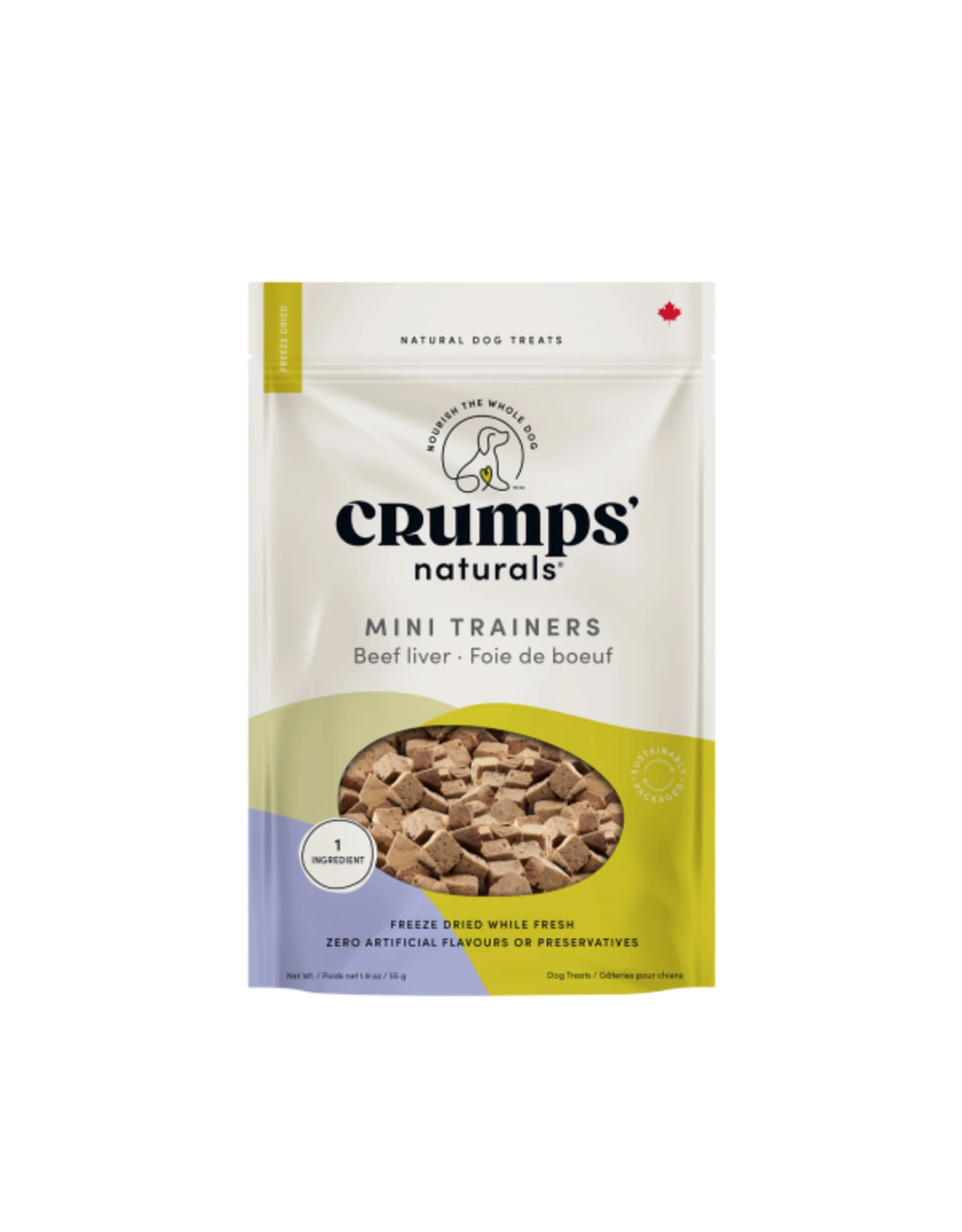 Crumps’ Dog Mini Trainers Freeze Dried Beef Liver are a play off their original freeze dried liver treats. With all the flavor packed into a smaller bite, their size makes them the perfect training treat. Made with no artificial colours, additives or preservatives, they come in a stand-up re-sealable bag. Made in Canada with Canadian beef liver, these one ingredient treats go hand in hand with a limited ingredient diet and are ideal for all size dogs. Low in calories, they are the perfect complement to a raw food diet.