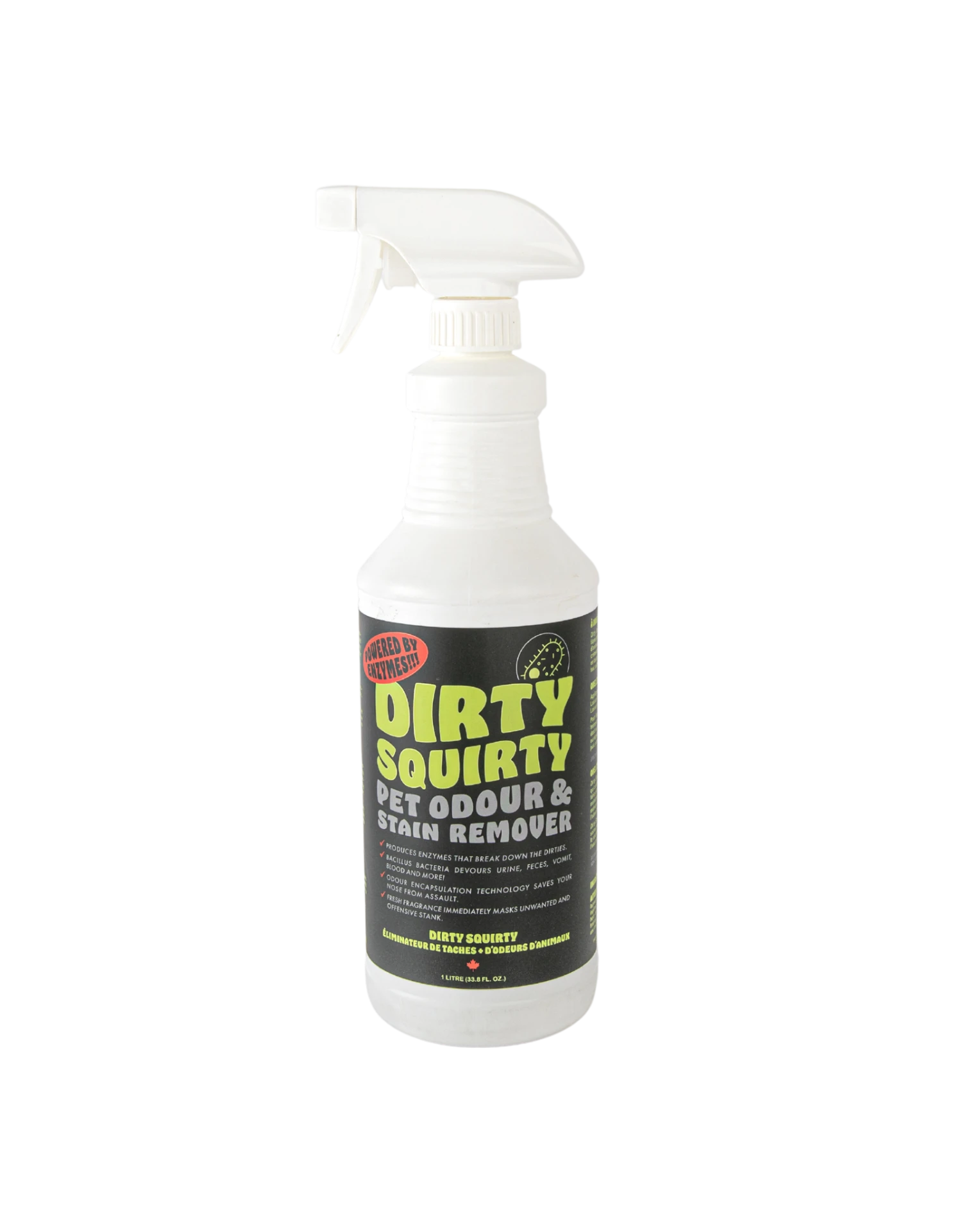 Dirty Squirty is a ready-to-use enzyme cleaning formulas designed for the removal of multiple pet stains and odours such as urine, feces, vomit, blood and more!
