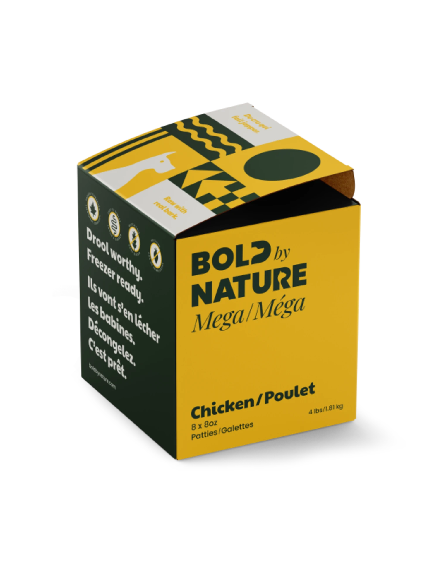 Mega protein. Mega flavour. Bold by Nature Mega Chicken Patties are full of farm-fresh ground chicken meat, triple- ground bone, organ meats, and veggies. Proudly Canadian, Bold by Nature Mega Chicken is easy to digest, gluten-free, and made with no fillers. Its drool inducing.