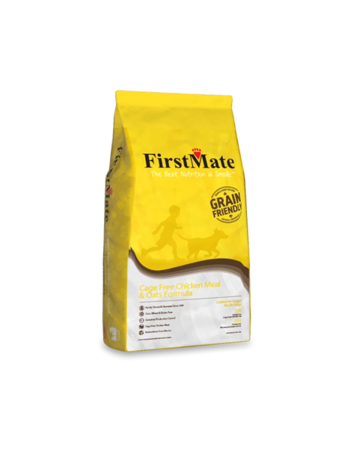 FirstMate Cage Free Chicken Meal & Oats Formula uses humanely raised Canadian chicken as a single meat protein and two wholesome grains. The Grain Friendly category is free of corn, wheat, soy, potato and peas making it optimal for daily feeding or sensitivities.