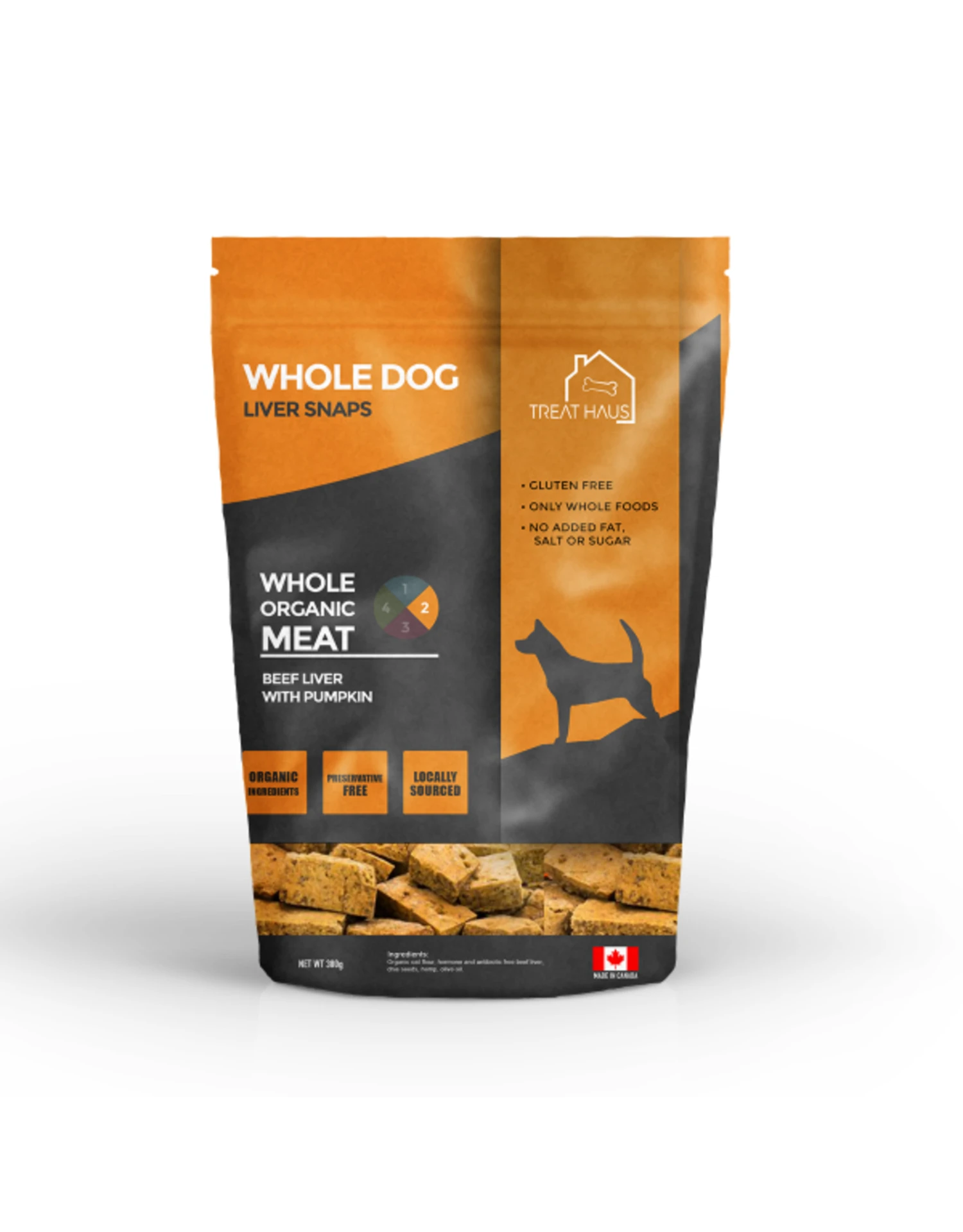 Your dog needs more than just treats. They need a whole complete organic treat diet. These TreatHaus WholeDog Liver Snaps are made with beef liver and pumpkin. They’re gluten free with no added fat, salt or sugar. Made with organic ingredients that are locally sourced and preservative free.