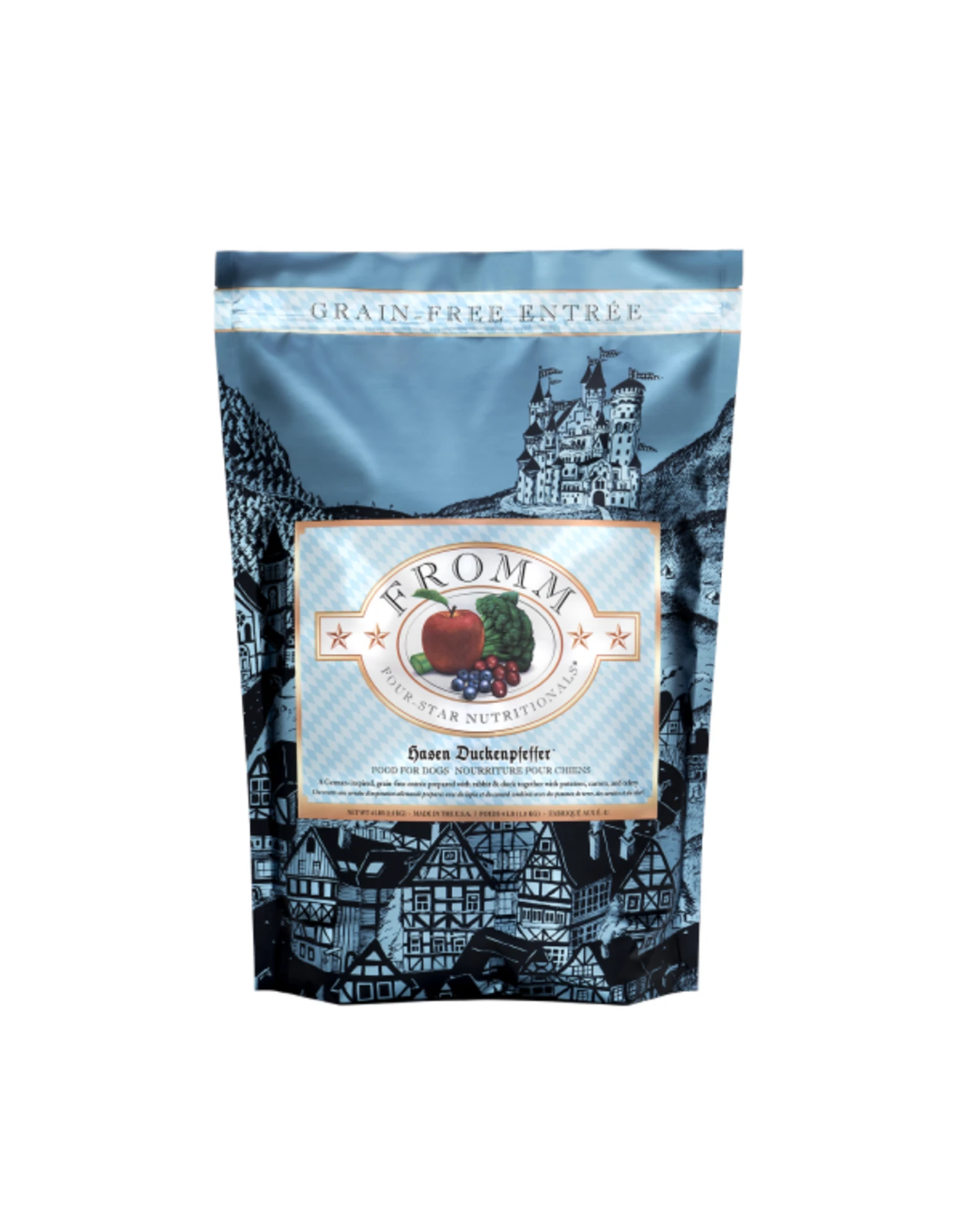 Fromm Four-Star Hasen Duckenpfeffer Food for Dogs is a savory, grain-free entrée based on the famed German stew served at Oktoberfest. The Hasen Duckenpfeffer recipe consists of rabbit and duck combined with hearty potatoes, carrots, and celery. This artisan blend is prepared in small batches, ensuring consistency, quality, and superior taste in each and every bowl. Hasen Duckenpfeffer provides complete and balanced nutrition for dogs of all ages and can be fed in rotation with other Fromm Four-Star varieties.