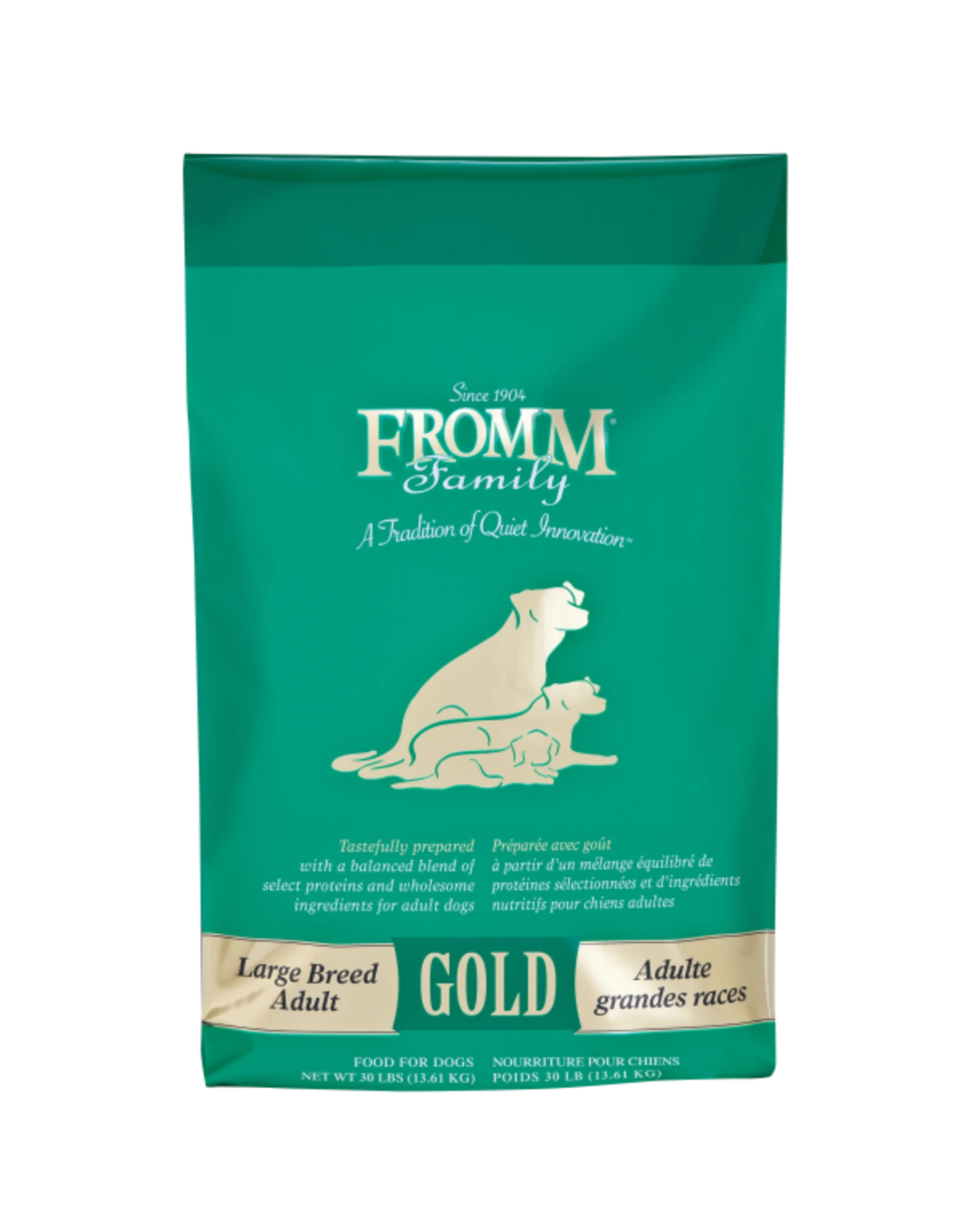 Fromm Gold Large Breed Adult is designed for breeds with adult weights exceeding 50 pounds. Tastefully prepared with select proteins and wholesome ingredients, Fromm Gold Large Breed Adult is enhanced with probiotics to aid digestion and salmon oil for a healthy coat. Fromm Gold provides a holistic approach to complete and balanced nutrition.