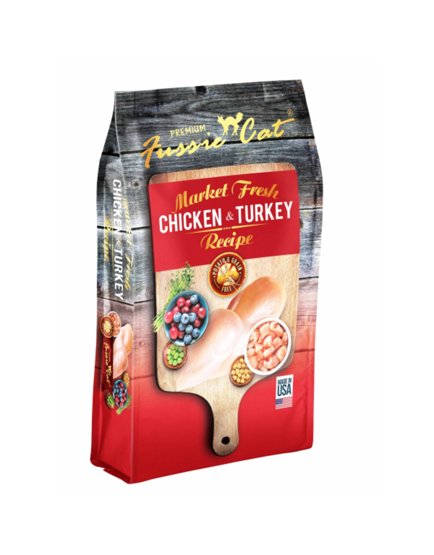 Fussie Cat Market Fresh Chicken & Turkey is a physiologically tuned, meat first, potato & grain free, super premium food for cats. Their Market Fresh recipes are created with the freshest and finest ingredients. Like Chicken & Turkey, which provides a complete, high-quality protein that’s an excellent source of Vitamin B12, Riboflavin and Phosphorus. Not only are Chicken and Turkey the first ingredients in this Market Fresh recipe, they’re also one extremely palatable for felines.