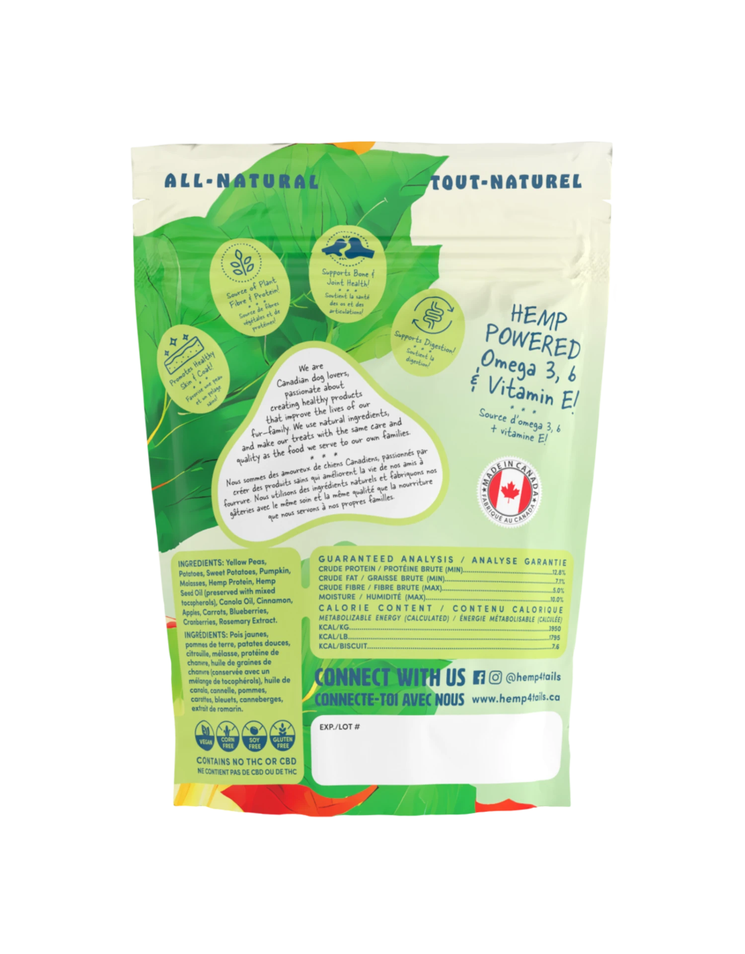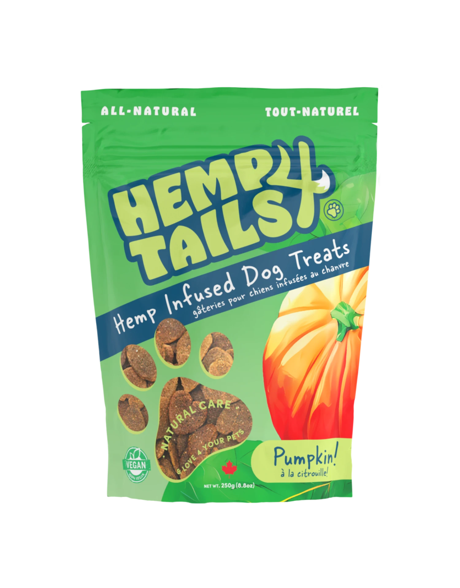 Hemp 4 Tails all-natural, hemp infused PUMPKIN dog treats provide a healthy source of plant fibre, protein, and essential fatty acids for your fur-family. 100% vegan and made in Canada from high-quality natural ingredients, they are formulated to promote a healthy skin & coat while also supporting your dog’s digestion and bone & joint health.