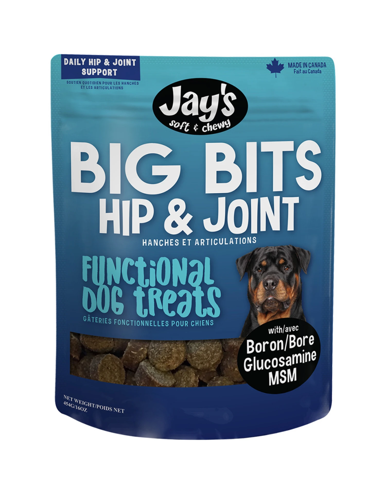 Jay’s Big Bits Hip & Joint Dog Treats are kettle cooked, simmered, and dry aged for superior flavour and quality. These treats are soft and chewy and include over 60 % fresh animal protein. They are also loaded with Glucosamine, MSM, and Boron to give your dog a daily dose of hip and joint support with all the flavour.