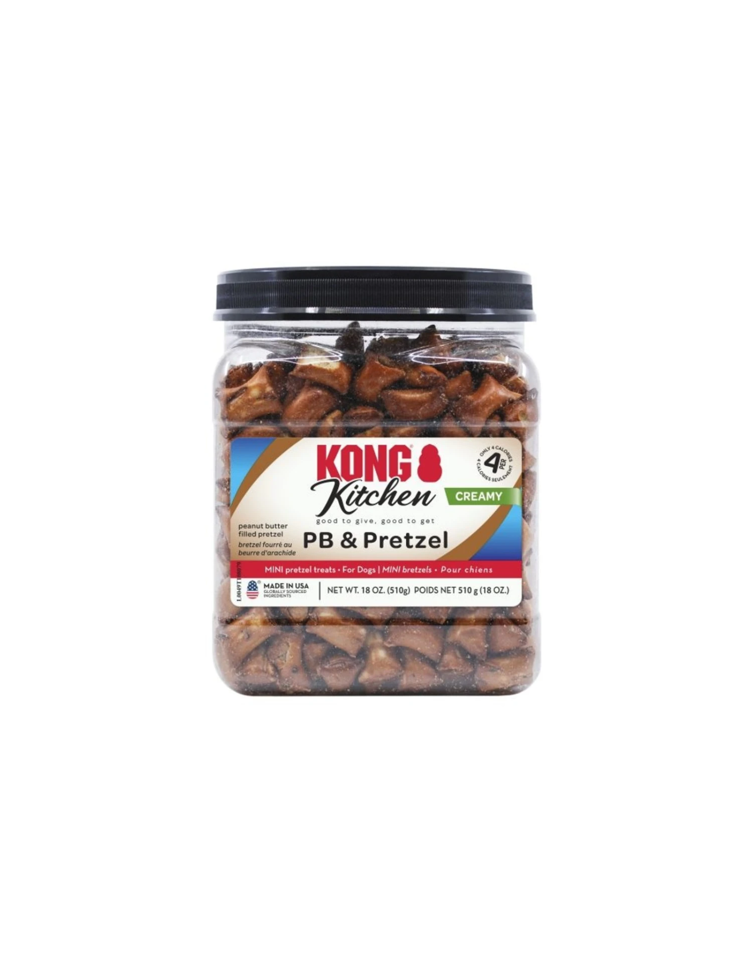 KONG Kitchen PB & Pretzels delivers a crunchy-on-the-outside, creamy-on-the-inside oven-baked real peanut butter snack. At just 4 calories a pop, they’re great for training or any time you’d like to show some love. These nuggets are so irresistibly creamy-crunchy-craveable, we put them in a special jar dogs can’t open (yet). Salt-free. Made in the USA.