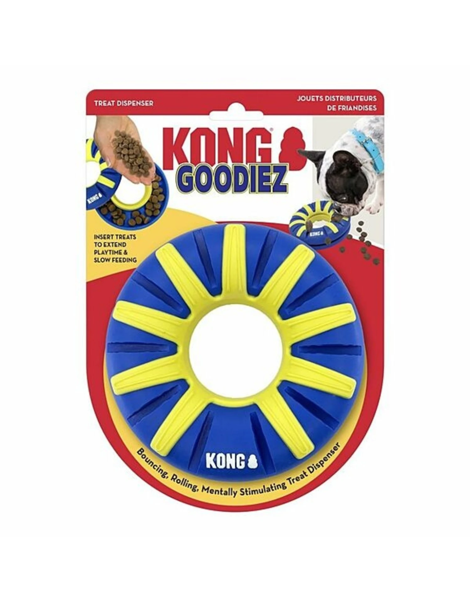 KONG Goodiez dispenses treats from between two durable layers from a gap that can be adjusted to 2 difficulty levels to satisfy dogs’ foraging instincts. This mentally stimulating food puzzle invites dogs to extract kibble by rolling and bouncing or by prying the sides apart. Fill top grooves with KONG Easy Treat to entice play. Twists open for easy filling and cleaning. Holds 1 cup kibbles—great for weight maintenance.