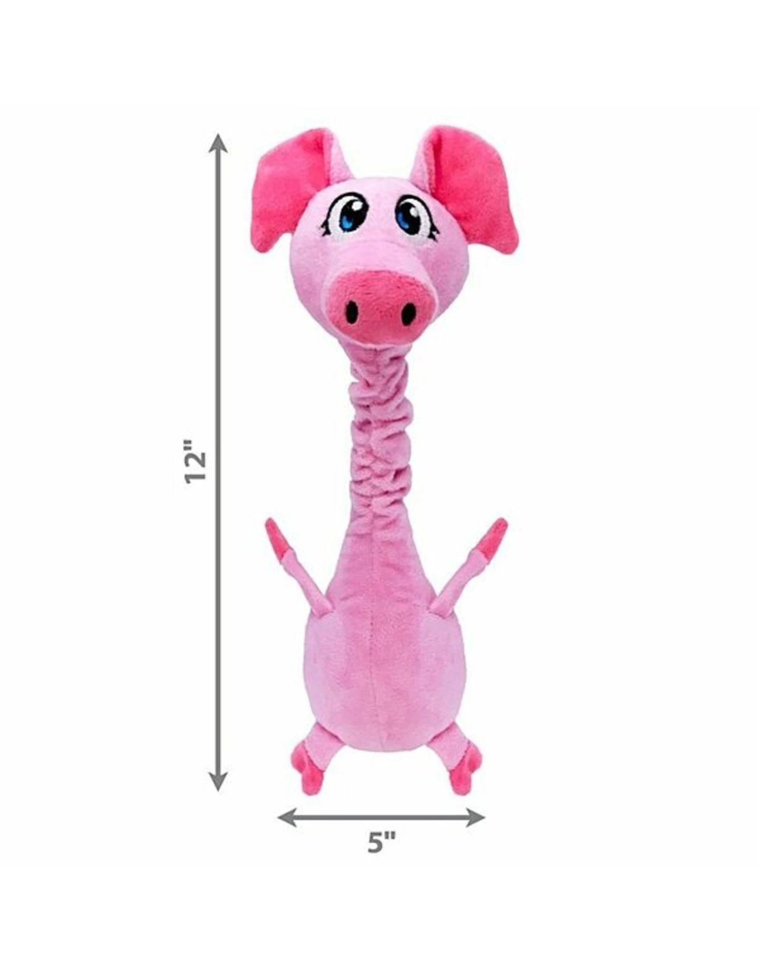 KONG Shakers Bobz Pig has a tough, flexible cord in his wobbly neck that lets him nod an invitation to thrash his long, floppy body in an instinct-satisfying bouts of barnyard bliss. The low-toned squeaker prolongs playtime while a layer of reinforcement extends the tugging, fetching and flinging fun.
