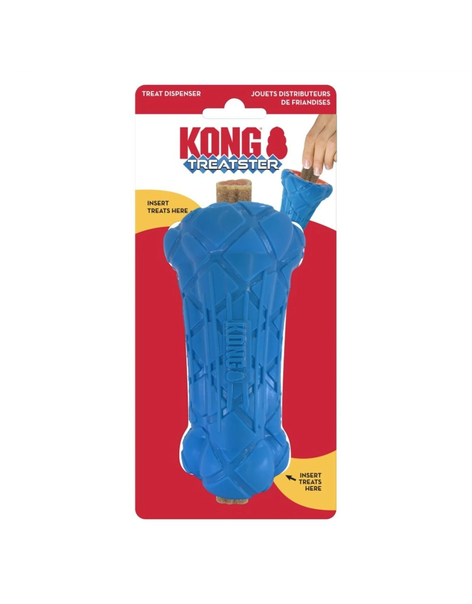KONG Treatster’s internal fins lock in treats and chews extending chewing fun while rewarding appropriate chewing behavior. The unique, tapered design holds a wide variety of treats, enticing natural foraging instincts. The further a treat is stuffed into the Treatster, the greater the challenge—and reward! This durable treat holder satisfies natural chewing instincts while providing a comfortable way to enjoy snacks.