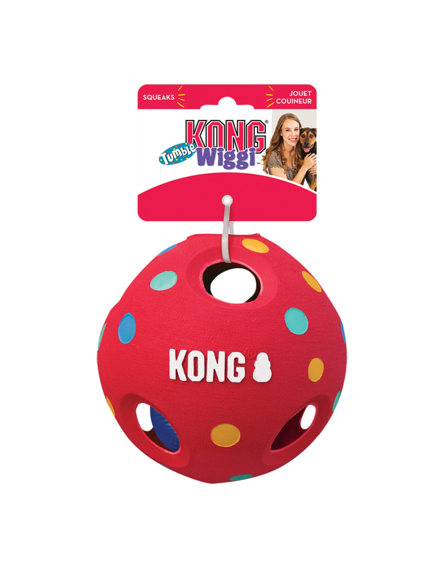 The KONG Wiggi Tumble ball doubles the engagement with an internal tumbling squeaky ball adding action and sound that entices chasing instincts. The natural latex material creates a flexible toy that is great for fetching fun. The easy grip openings are ideal for tugging and fetching interactive play. Easy on teeth and gums this toy also features a wipeable material that is easy to clean