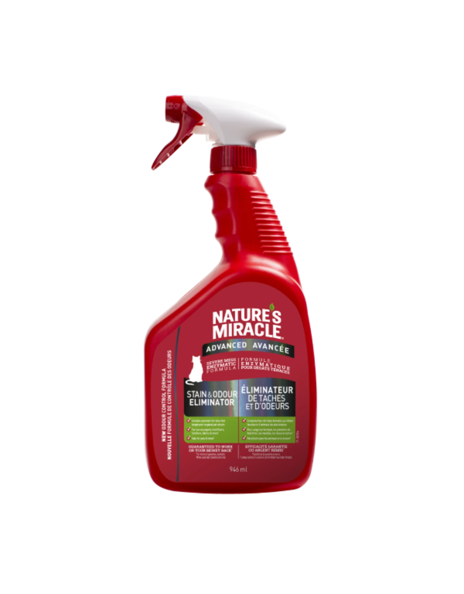 Nature’s Miracle Advanced Stain and Odor Eliminator works to discourage re-soiling by removing the odor of cat messes. The bacteria-based formula produces enzymes when it comes in contact with bio-based messes including severe urine, diarrhea, vomit and blood. The Stain and Odor Eliminator is safe to use on carpets, hard floors, furniture, fabrics and more, when used as directed, and leaves you with a light fresh scent.