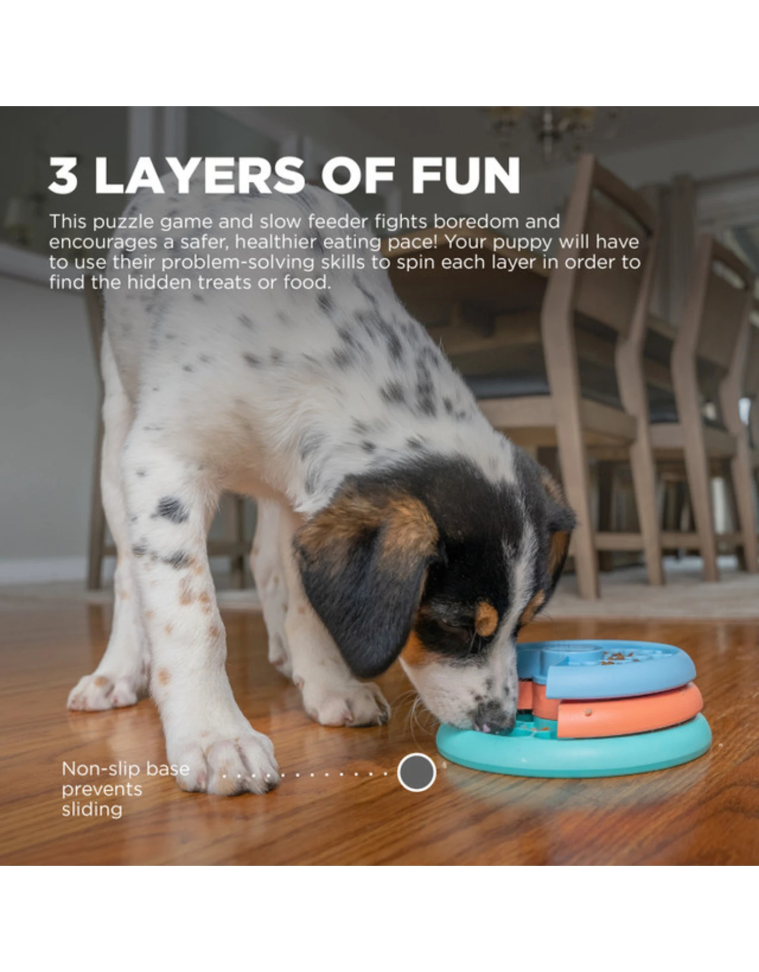 - 3 layers of snack spinnin’ fun:Dogs will have to use their problem-solving skills to spin each layer in order to find the hidden treats.