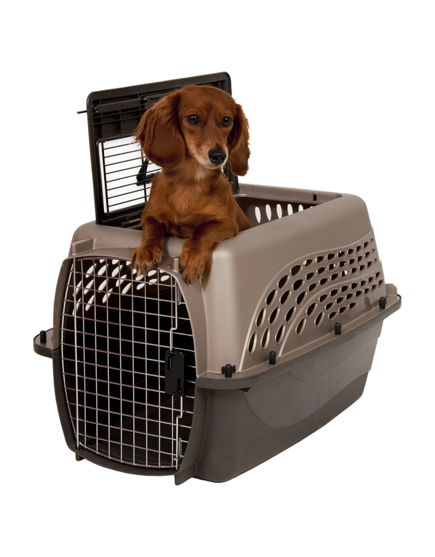The Petmate® Two Door Top Load Kennel offers easy access to your pet. Your furry friend will enjoy superior ventilation and visibility while pet parents will appreciate the modern design. This kennel is great for travel and for house-training. Constructed of sturdy yet stylish heavy-duty plastic, the steel wire and plastic combine for strength, safety, and visibility. Features also include secure wing-nut and bolt design, steel front door with secure latch, and ergonomic carry handle. Kennels with a top door reduce stress for the animal when being placed into and out of the kennel. With vents on all sides and the top, this kennel also has superior ventilation and visibility making a comfortable environment for the pet. Easy to assemble. Can be easily cleaned using soap and water. Sizes available to accommodate pets ranging from 5 to 15 pounds. Plastic made in the USA, handle and other components imported. Two Door Top Load Kennels are NOT accepted for air travel. Please contact your specific airline before traveling for verification of their requirements.