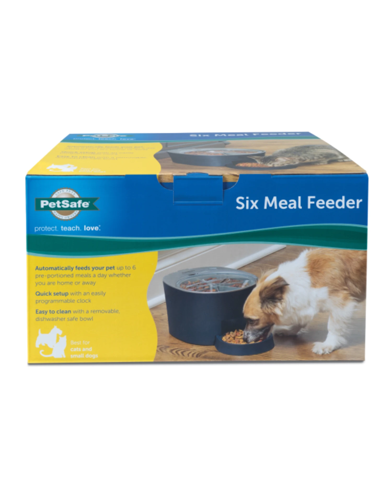 The PetSafe Six Meal Feeder is designed for the busy pet parent. It is great for feeding your pet during the day while at work or while traveling for the weekend. Use the digital clock to program six pre-portioned meals per fill – whether it’s six smaller meals a day, two meals a day for three days, or one large meal every day for six days. Each tray slot holds 1 cup of dry dog or cat food, plus the bowl holds 1 cup for an extra meal that is ready-to eat. The PetSafe Six Meal Feeder keeps your pet’s healthy feeding routine no matter where you are.
