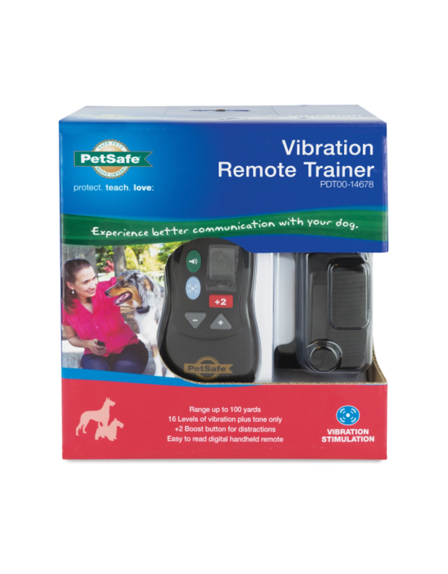 The PetSafe Vibration Remote Trainer helps you control your dog without a leash from up to 100 yards away. The remote trainer is a safe, effective way to teach better behavior or basic obedience commands. At the push of a button, your handheld remote sends a signal that causes your dog’s receiver collar to vibrate. The vibration safely and effectively gets your pet’s attention. The remote is easy to use with an advanced digital display that tells you exactly which level of vibration you’re using. Choose from 16 levels of vibration stimulation to find just the right level for your dog.