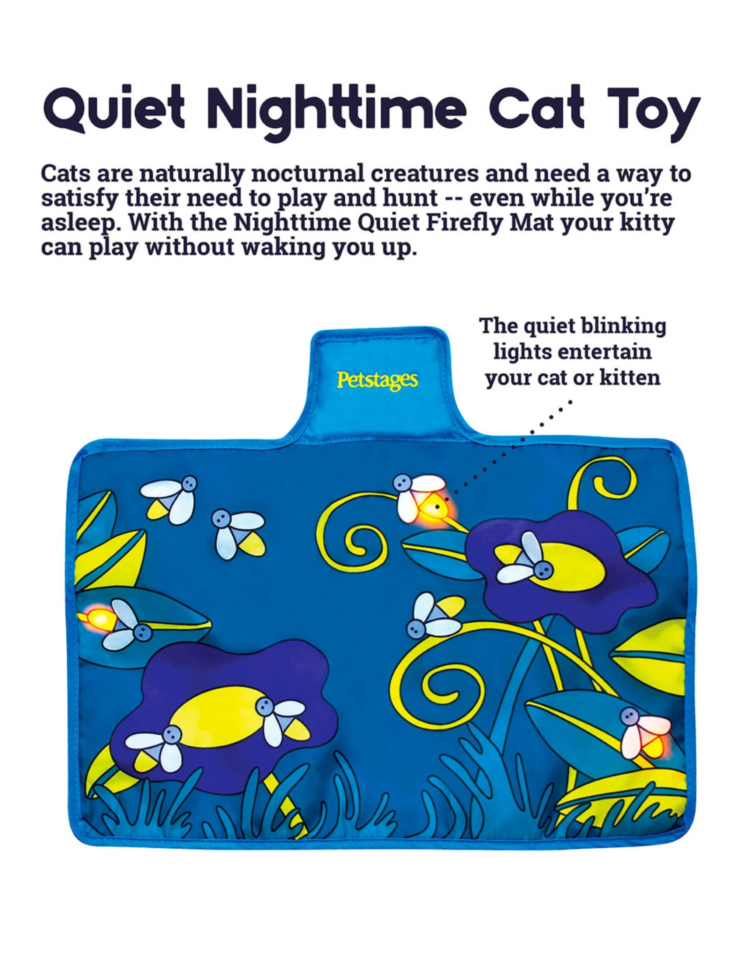 - quiet nighttime cat toy:Cats are naturally nocturnal creatures and need a way to satisfy their need to play and hunt — even while you’re asleep. With the Nighttime Quiet Firefly Mat your kitty can play without waking you up.