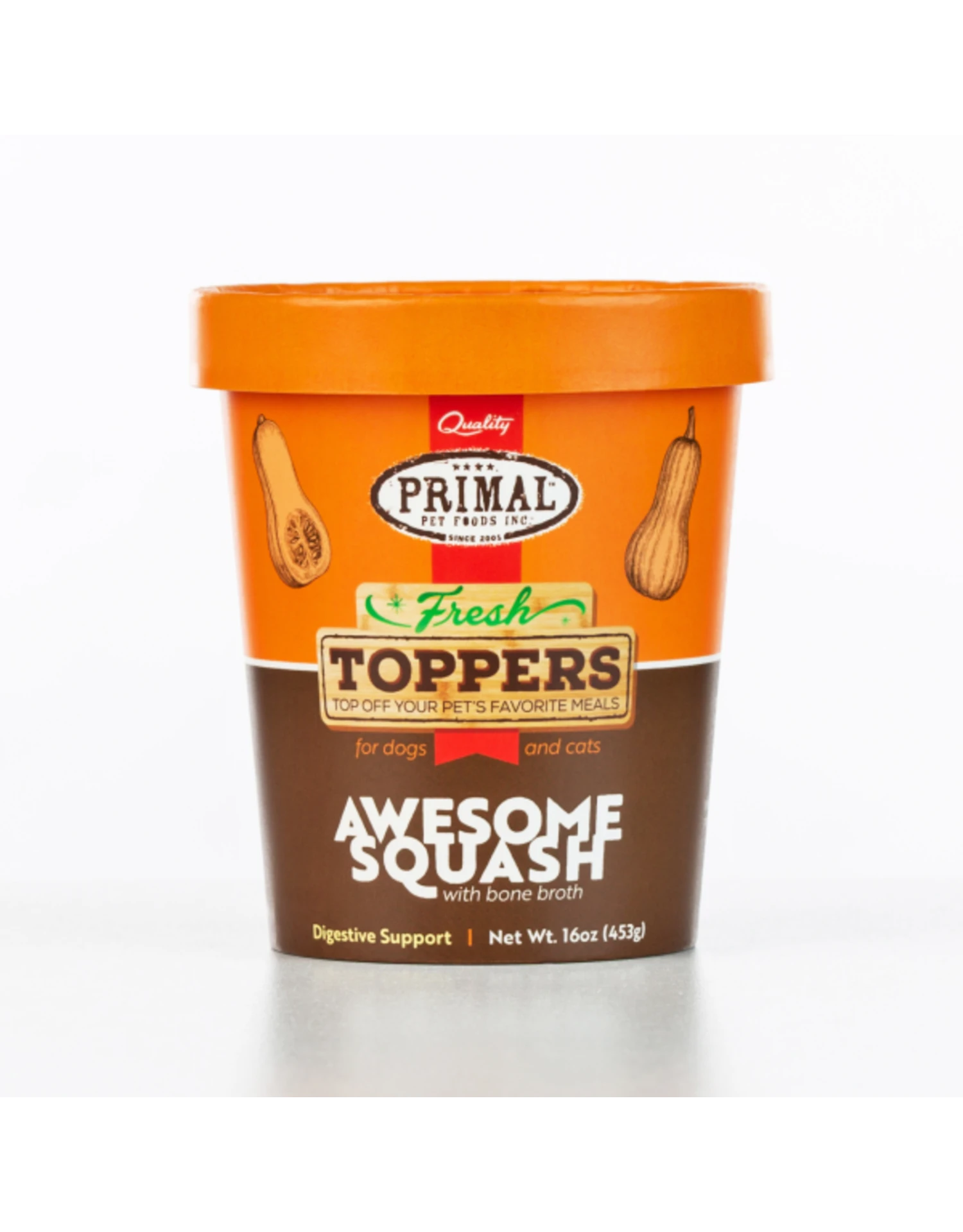 Primal Fresh Toppers are aromatic whole food toppers that feature functional ingredients. Primal Awesome Squash is formulated to support your pet’s digestion with gut-nourishing butternut squash, probiotic-packed apple cider vinegar, and organic cinnamon, turmeric, and ginger. Organic butternut squash provides prebiotic fiber to nourish the gut and feed you pet’s microbiome. Powerful probiotics support a healthy GI tract. Raw organic unfiltered apple cider vinegar provides enzymes, acid balance, and probiotics.