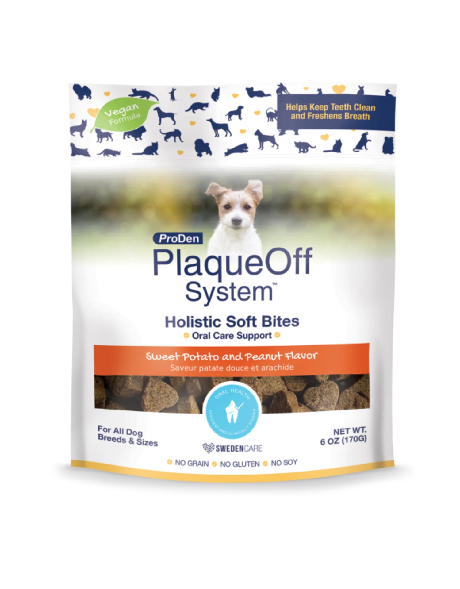 ProDen PlaqueOff System Holistic Soft Bites Oral Care Support are formulated to supplement your dog’s daily oral care routine. This delicious vegan formula is suitable for all dog breeds and sizes. Designed to help maintain clean and fresh breath, Holistic Soft Bites for Dogs contain no grain, no gluten, and no soy.