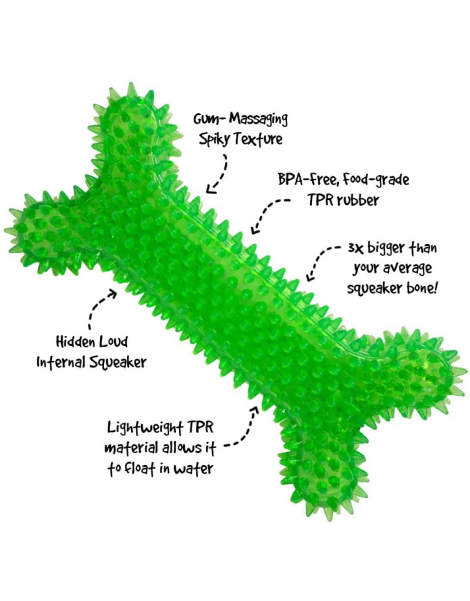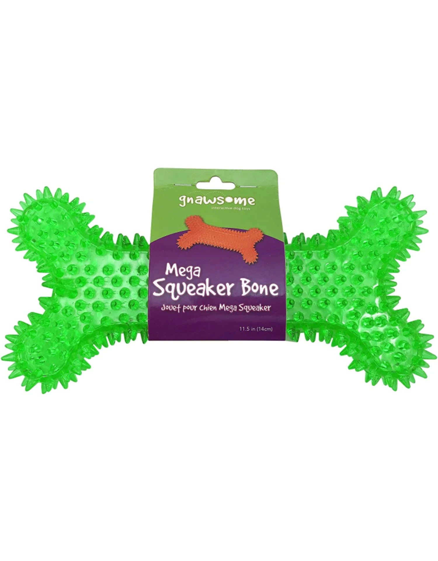 Throw your furry friend a different kind of bone with the Gnawsome Spikey MegaBone Dog Toy. It features a unique spiky texture that is durable and massages your furry friend’s gums as he gnaws. This toy includes a loud squeaker on the inside to keep your paw-tner interested and entertained. It is also made of BPA-free, food-grade TPR rubber for safety. Ideal for a game of fetch or other rough play, Gnawsome Spikey MegaBone Dog Toy provides you and your companion with hours of interactive bonding that you both will enjoy.