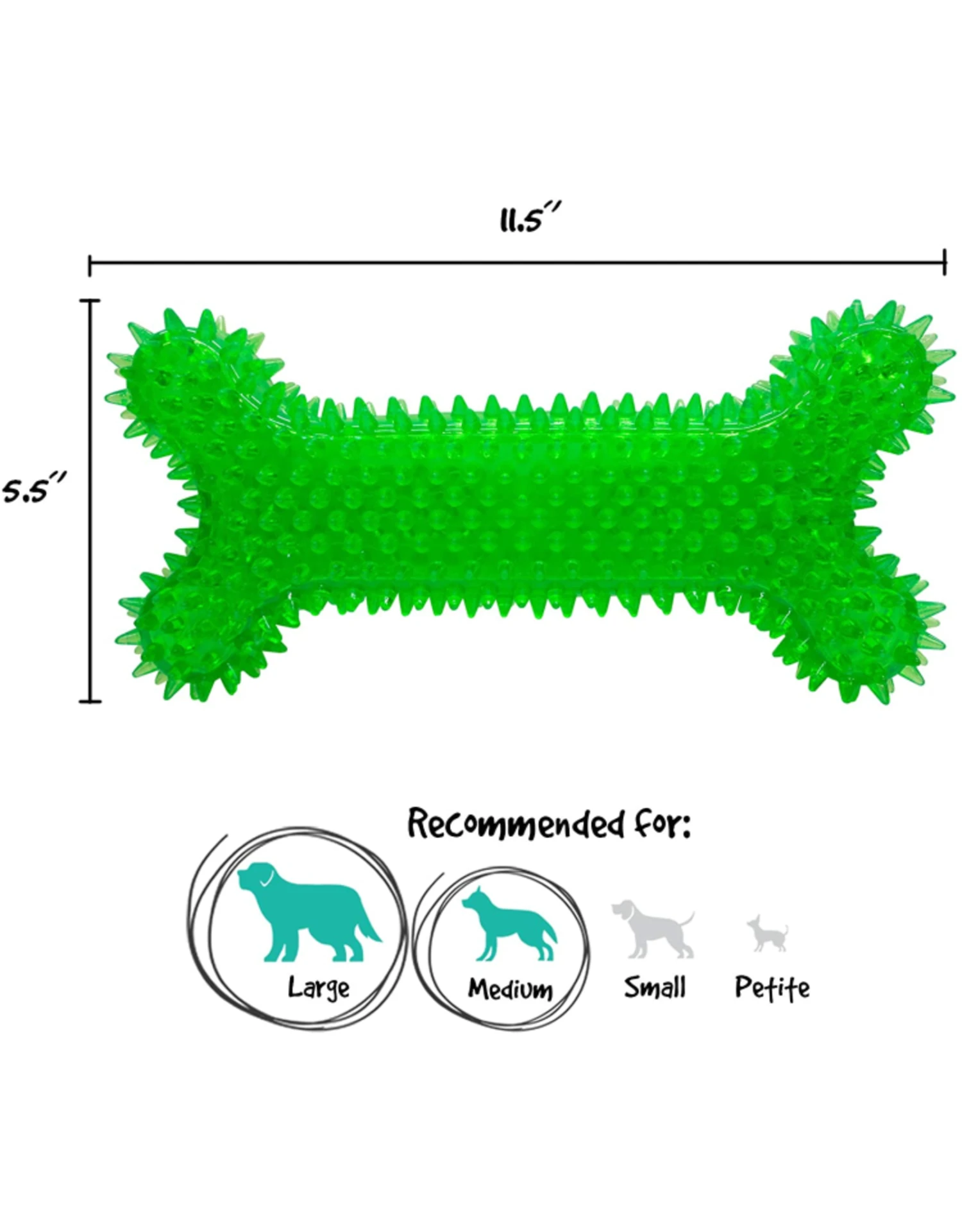 - Durable bone toy that features a unique spiky texture that massages your pup’s gums.