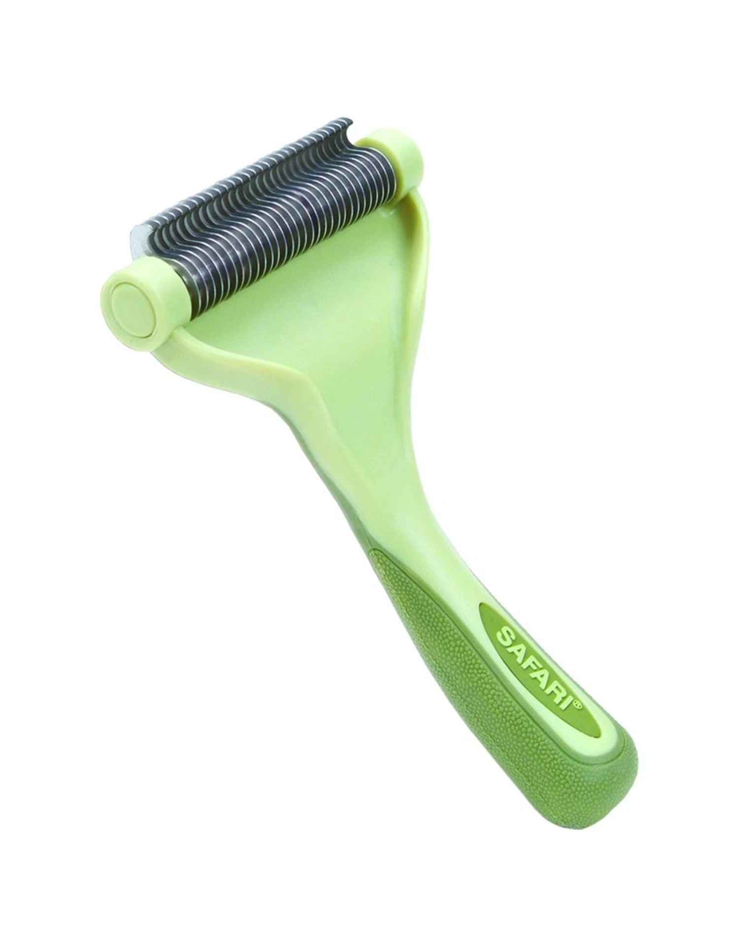 Stop excessive shedding with the Safari® Shed Magic® De-Shedding Tool for Dogs with Medium to Long Hair! This brush is great for removing loose dog hair, stubborn mats, and tangles without irritating your dog’s skin. The gentle stainless steel blades glide through the hair without pulling, making grooming more comfortable for your dog. Plus, its textured handle provides added comfort and maximum control. Designed specifically for medium to long coated breeds like Shepherds, Akitas, and Collies, this brush makes it easy to maintain a healthy and beautiful coat.