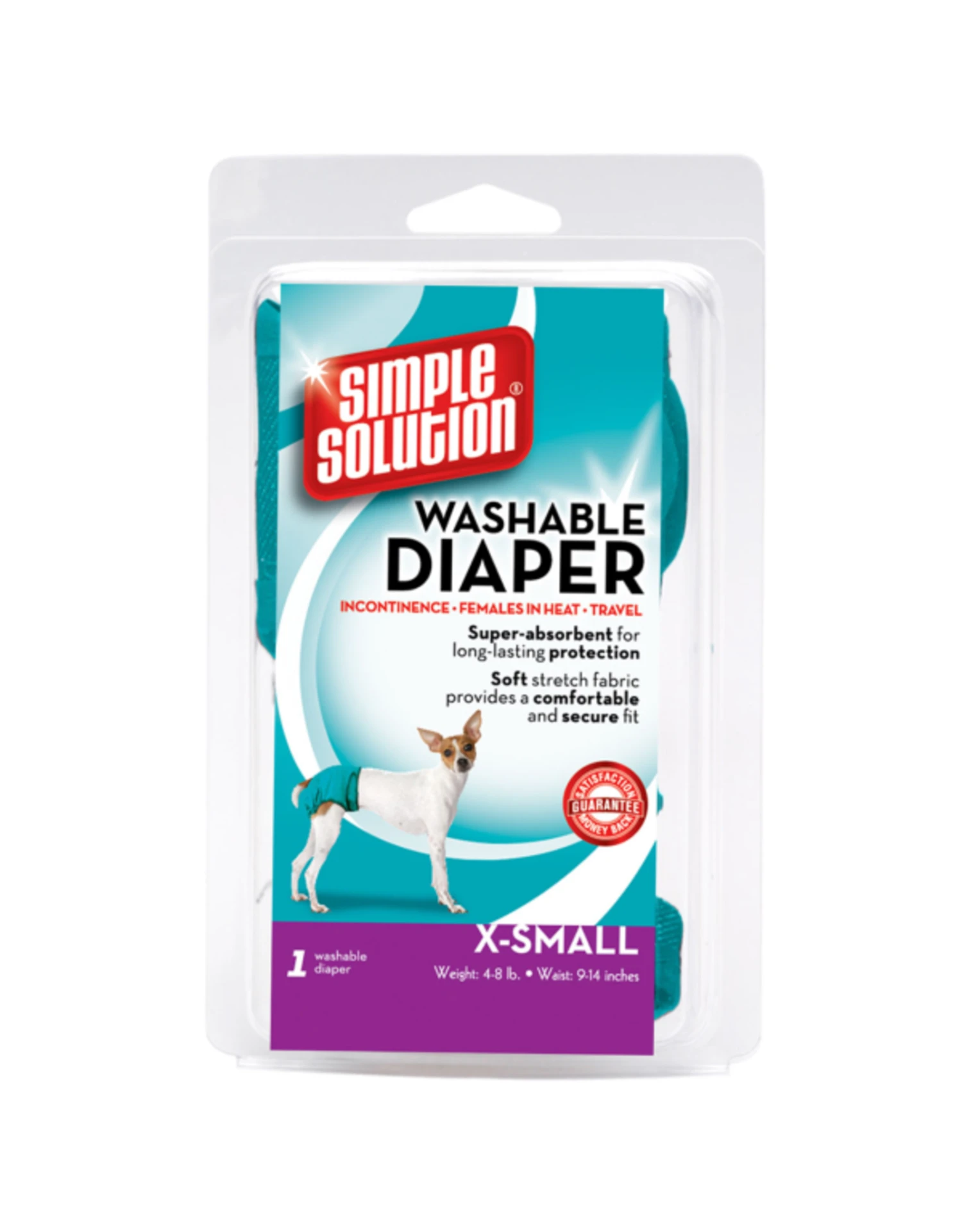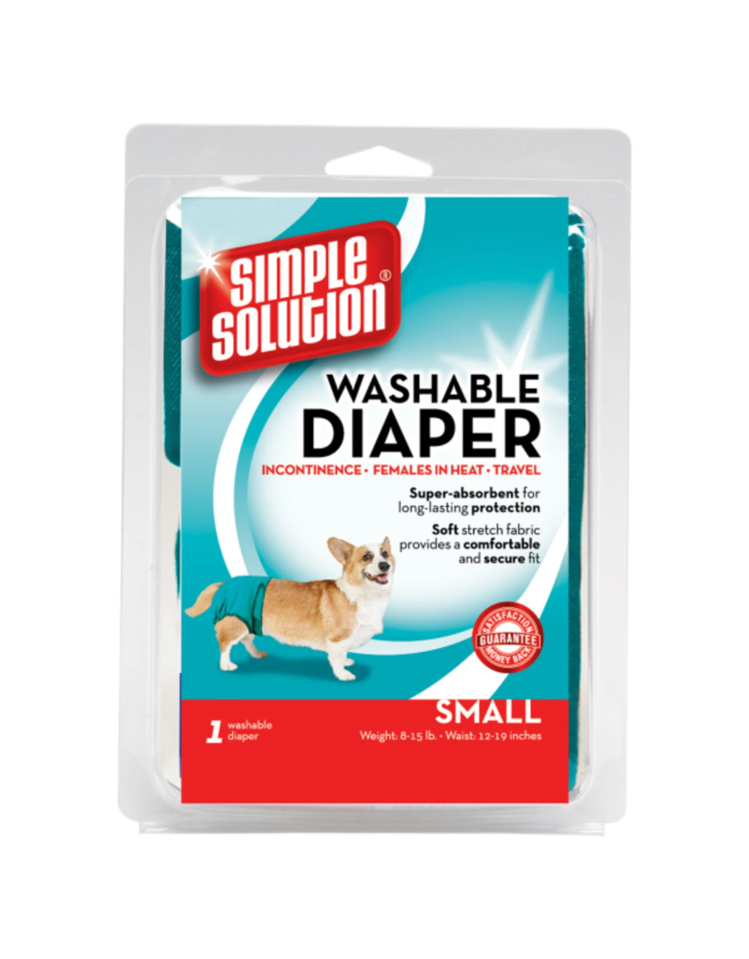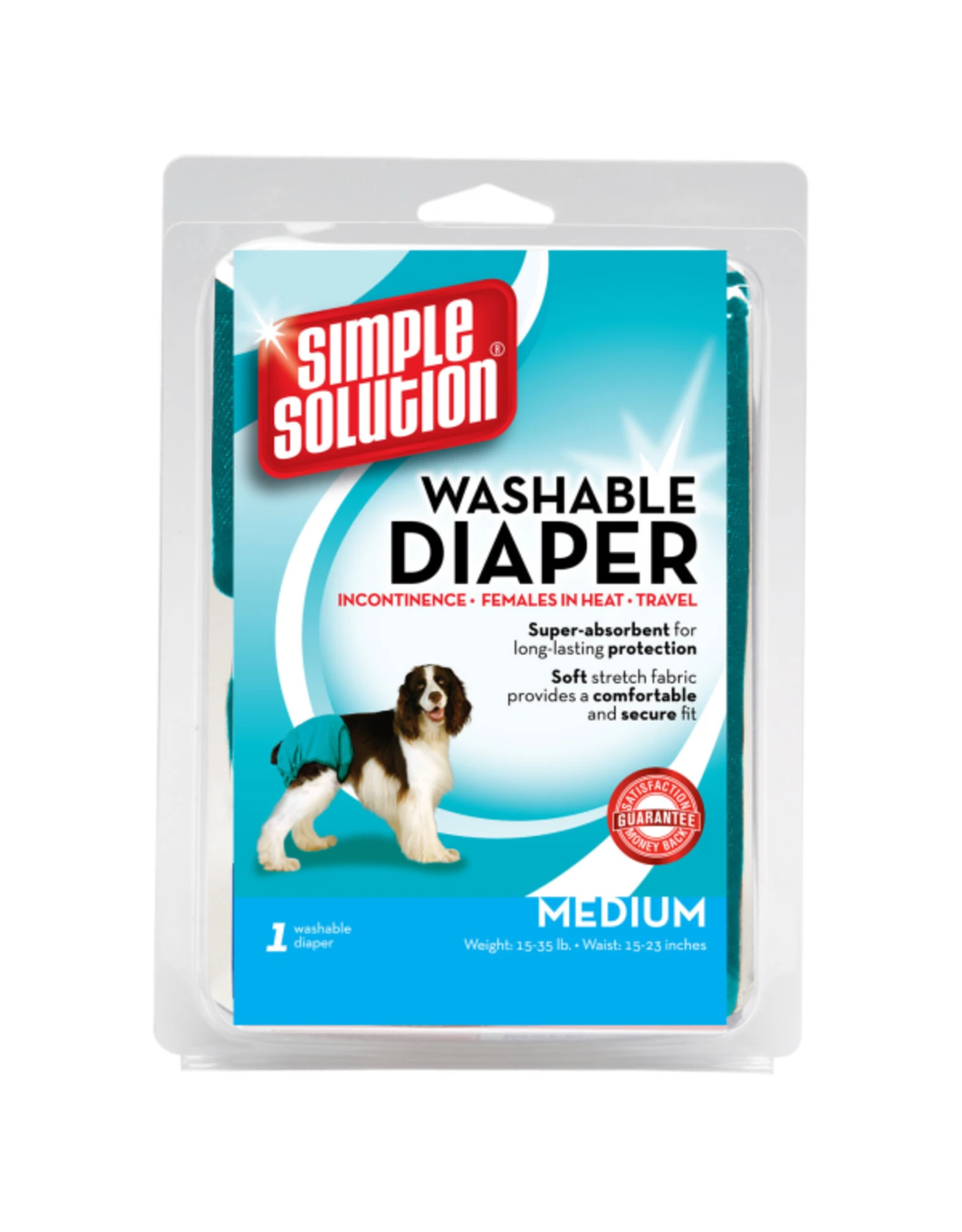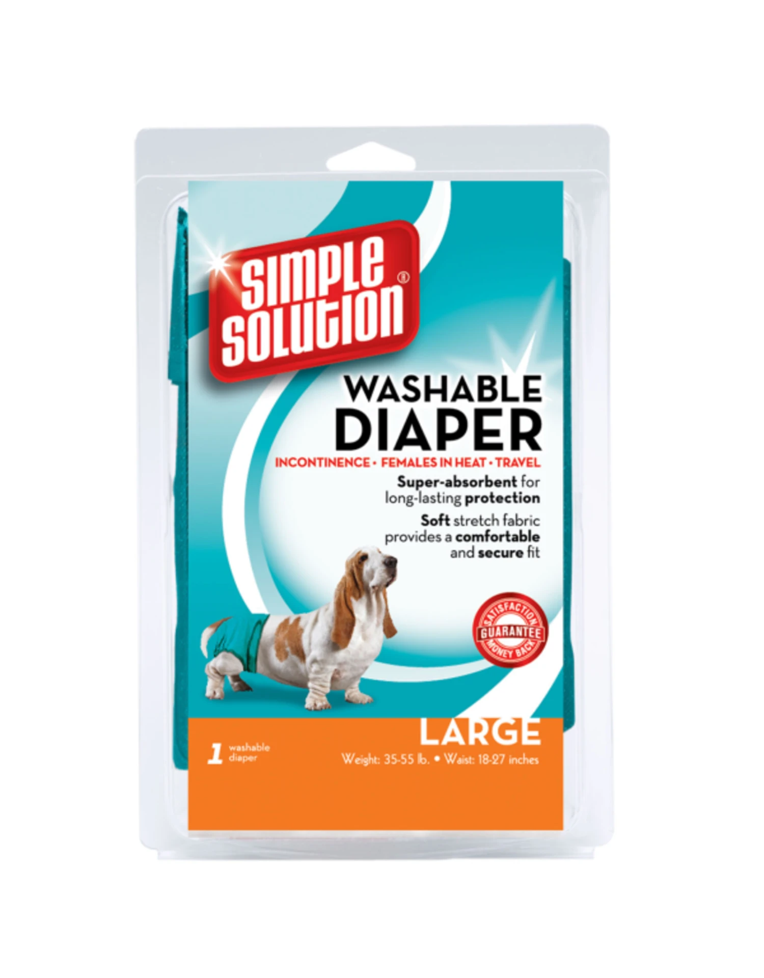 Simple Solution Washable Diapers are made from lightweight microfiber fabric with re-positional closures and a tail hole for ultimate comfort. The soft, stretch fabric provides a comfortable and secure fit. These super-absorbent diapers provide long-lasting protection and are perfect for preventing messes from females in heat, urinary incontinence and excitable urination.