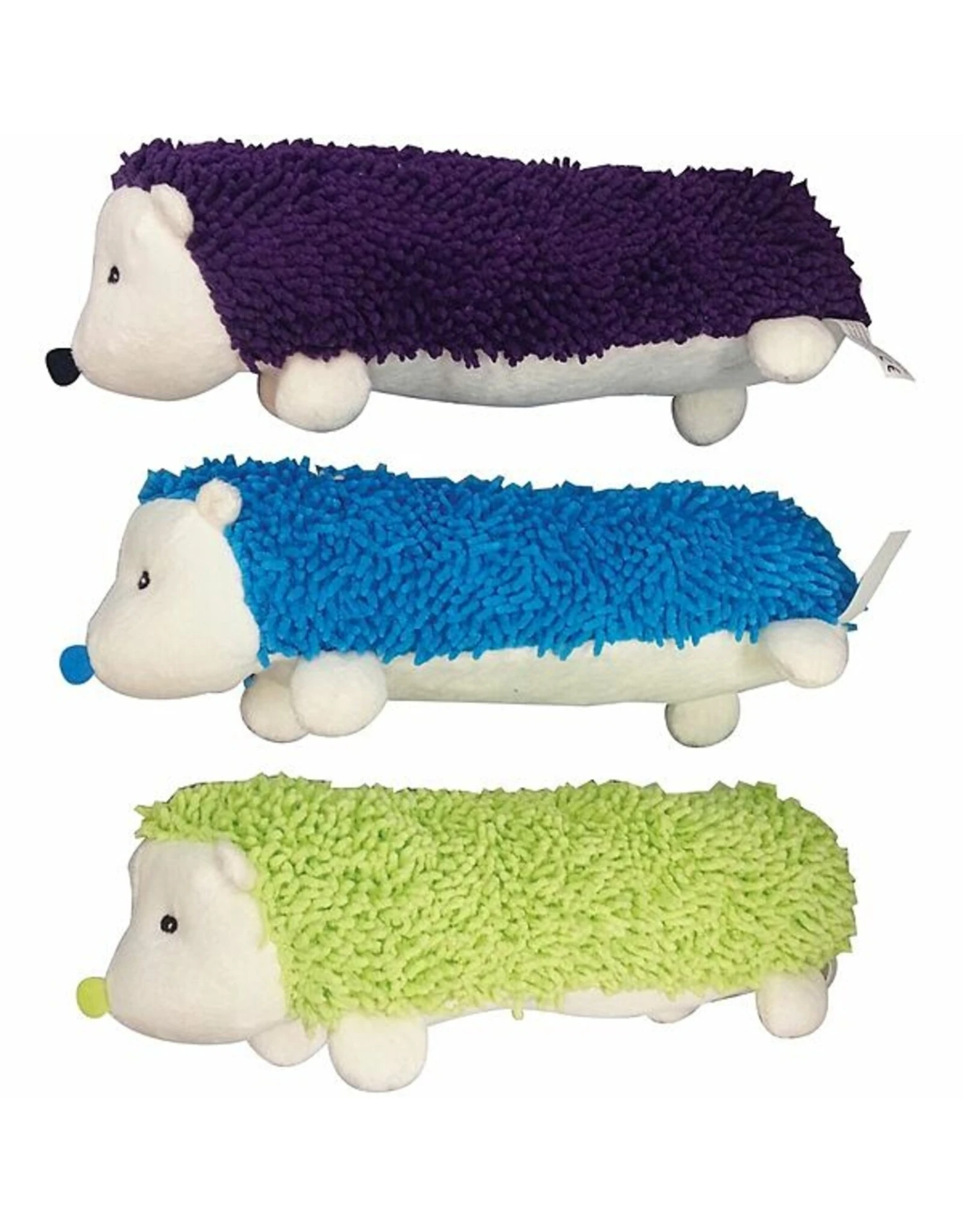 Textured plush hedgehog with giggle sound mechanism inside. Three assorted colors