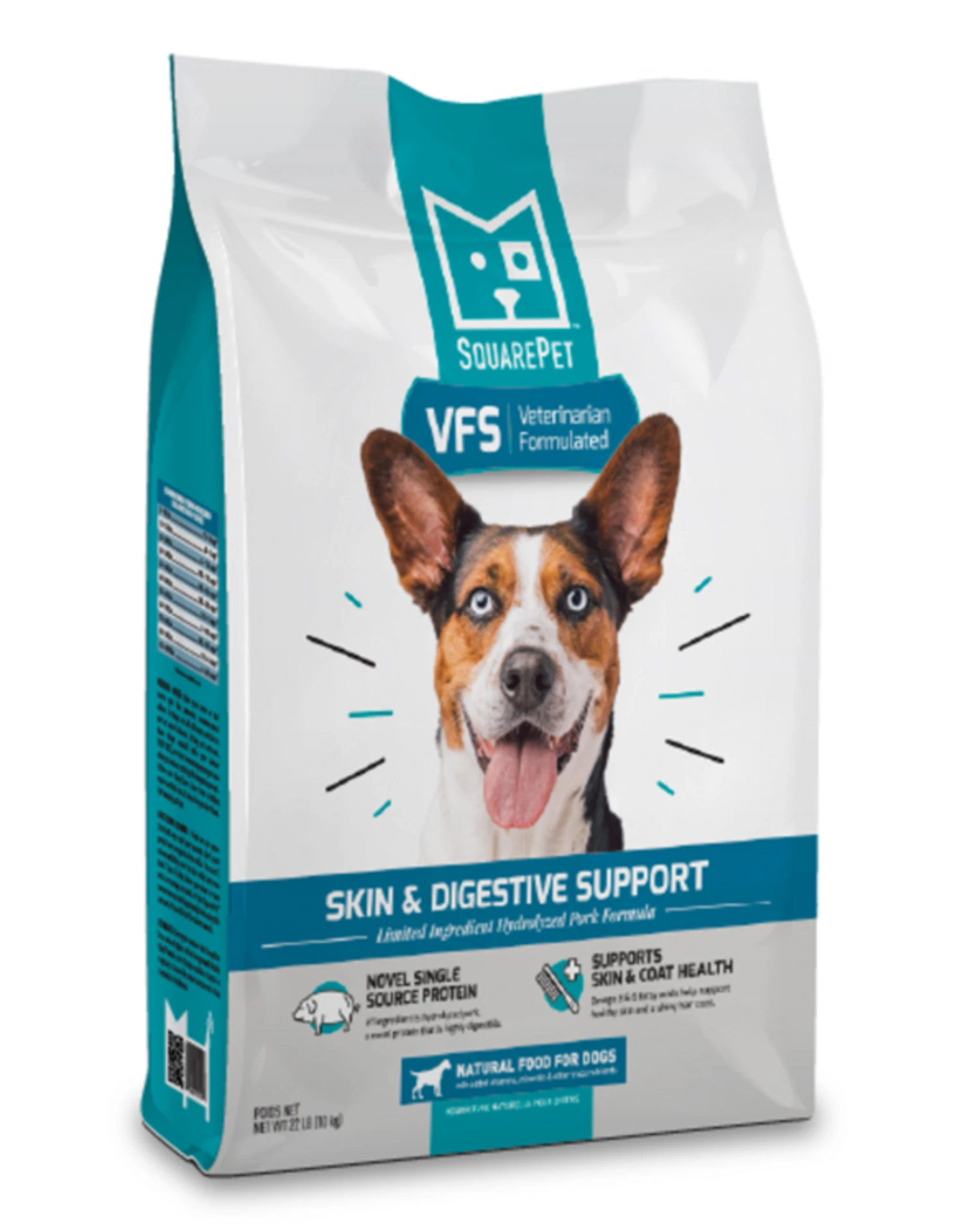 SquarePet™ VFS Skin & Digestive Support formula for dogs is a unique, limited ingredient diet made with a similar type of hydrolyzed protein that you would find in top veterinary diets. Similar to proteins used in some infant formulas, hydrolyzed proteins are proteins that have been broken down into smaller (nano-sized) components. The result is an exceptionally digestible protein source that may go undetected by the immune system during digestion. This could be beneficial for those special dogs that may be sensitive to common pet food ingredients.