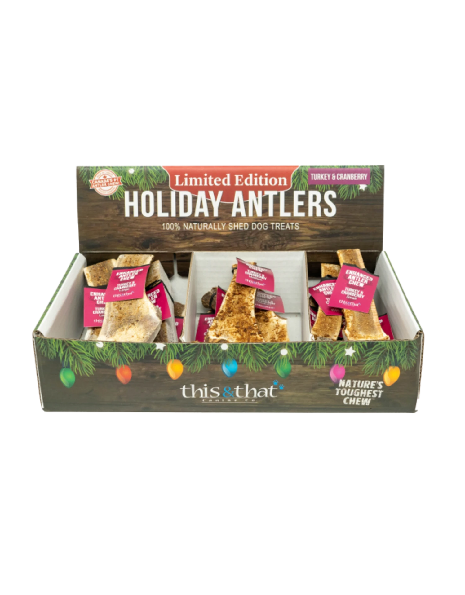 This & That Limited Edition Holiday themed display box comes with 18 Enhanced Antler Chews which feature a layer of turkey & cranberry flavour to enhance the natural marrow flavour. They’re sure to keep dogs busy with longer lasting excitement. Included with the display are the following sizes: 8 Small 5.5″, 6 Medium 6.5″, and 4 Large 7.5″. These Turkey & Cranberry antlers have a regular UPC tag for easy selling after the holidays.