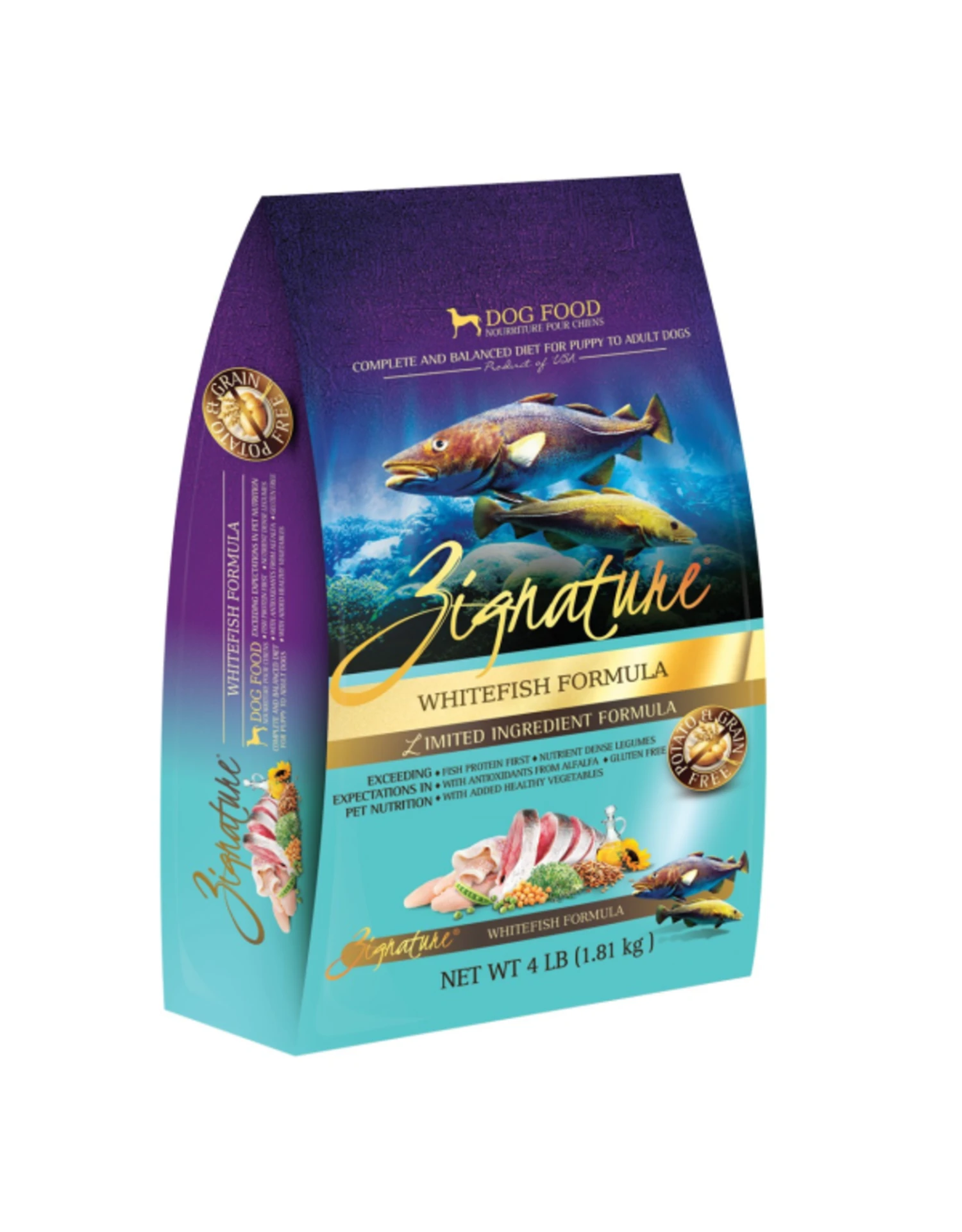 Zignature’s Whitefish Formula comes from the fish that are found in the cold waters of the Pacific Northwest and Alaska. Whitefish is not oily like Salmon, but it still contains heart healthy Omega-3 fatty acids, as well as vitamins and minerals for a healthy, happy dog. Whitefish is a rich source of Niacin, Phosphorous, and Selenium. And Zignature’s recipe is completely grain free, providing a hypoallergenic option for those dogs that may have food sensitivities or allergies. Zignature Whitefish Formula – Learned from Nature, Crafted to Perfection.